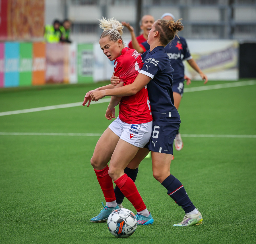 Elísa hrindir leikmanni Slavia. Skiljanlega pirruð. Þær eru að reyna allt til að tefja.