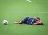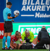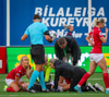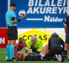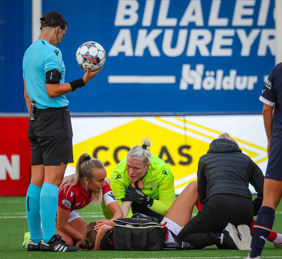 Mist haltrar út af. Hún getur ekki haldið leik áfram, ég held að það sé pottþétt. Pétur notar stoppið til að taka fund með sínu liði.