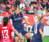 Lára með skallann eftir hornspyrnuna en bjargað á línu.