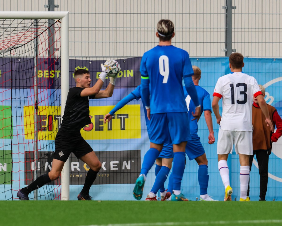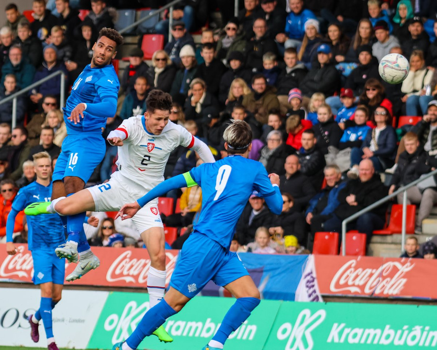 Langt innkast frá Ísaki Óla inn á teig þar sem Ísak Snær var í baráttunni en Tékkarnir ná að skalla frá.