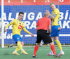 Smá æsingur hér. Theodór fær gult, hefði örugglega getað veifað fleiri spjöldum. Þorri Mar liggur eftir.