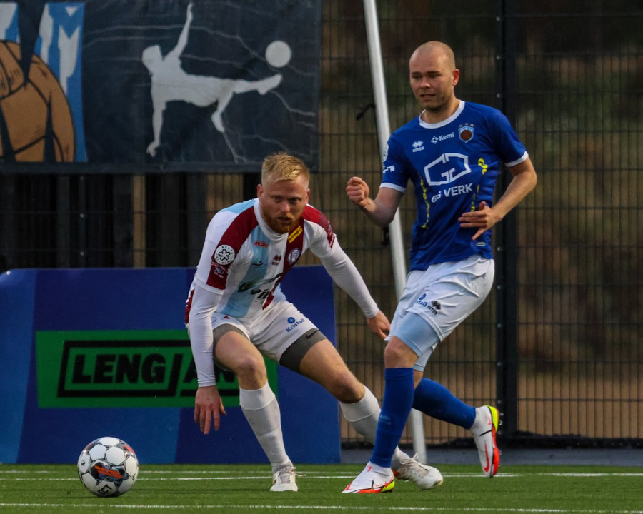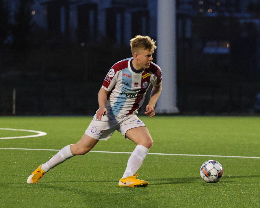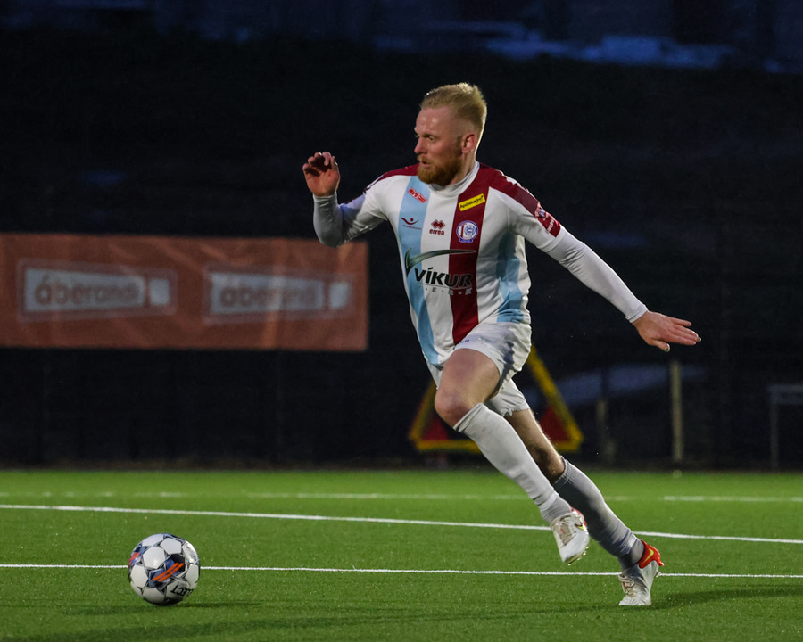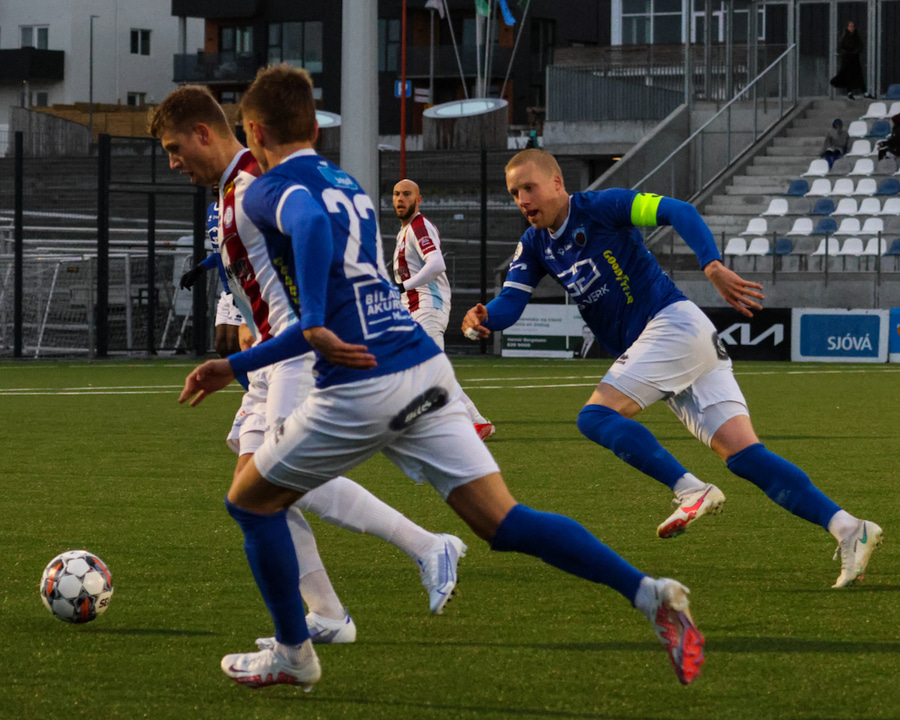 Jannik nálægt því að sleppa einn í gegn eftir stungusendingu en Binni Hlö bjargar með mjög góðri tæklingu