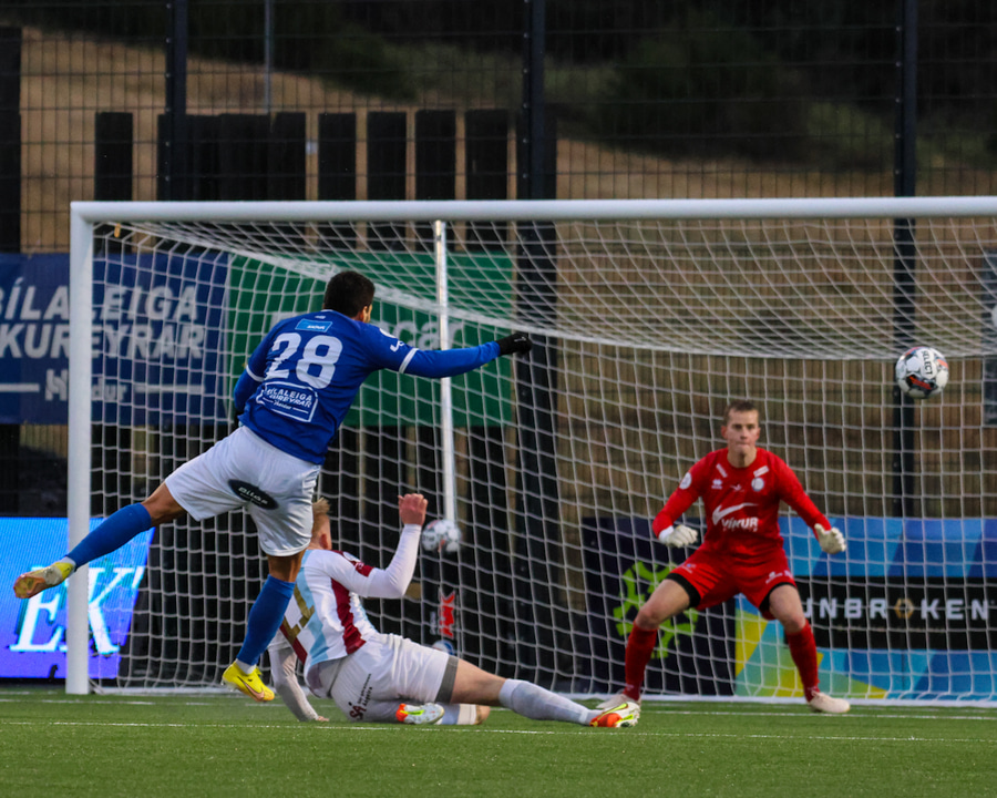 Hjalti nálægt því að koma gestunum í 2-0. Vinnur boltann af Má Ægissyni og keyrir í átt að marki. Skot hans hefur viðkomu í varnarmanni og þaðan í horn sem ekkert verður úr. Sterk byrjun hjá Leikni