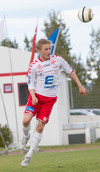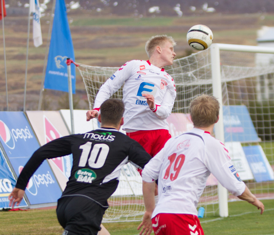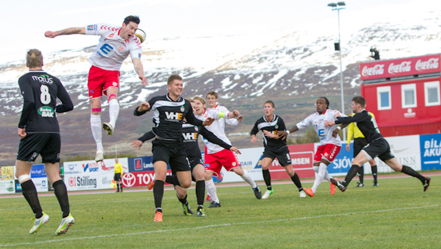 Ármann Pétur Ævarsson kemst í gott skallafæri við vítapunktinn en skalli hans fer yfir markið. Það var Sveinn Elías sem átti sendinguna fyrir úr aukaspyrnu á hægri vængnum en Ármann var alveg hressilega einn og óvaldaður.