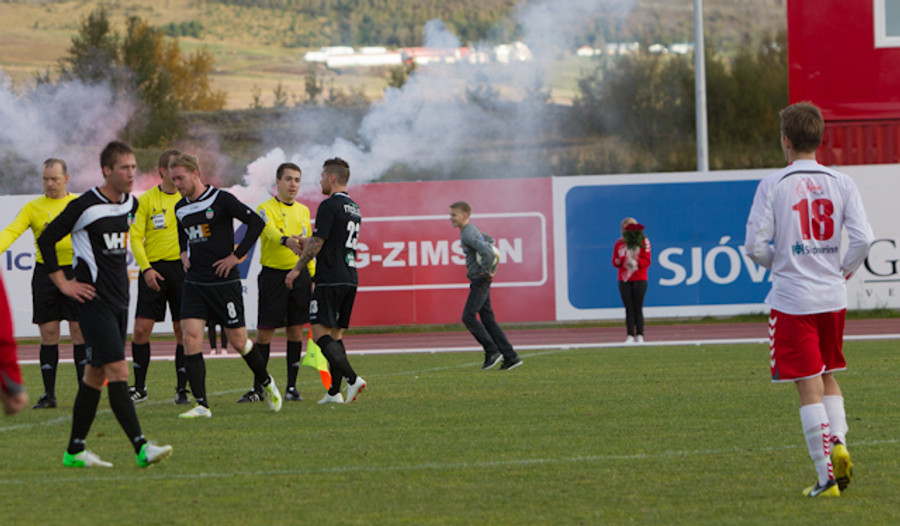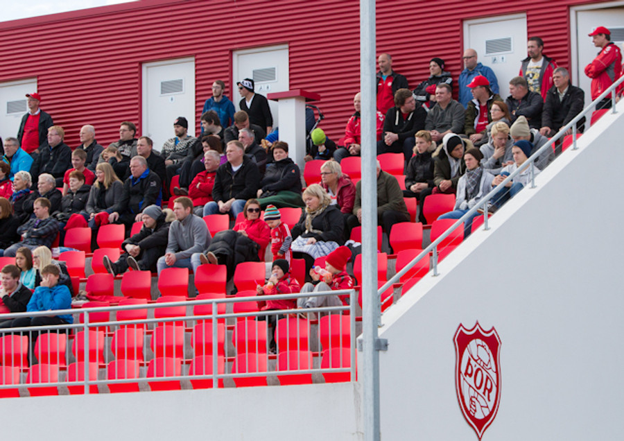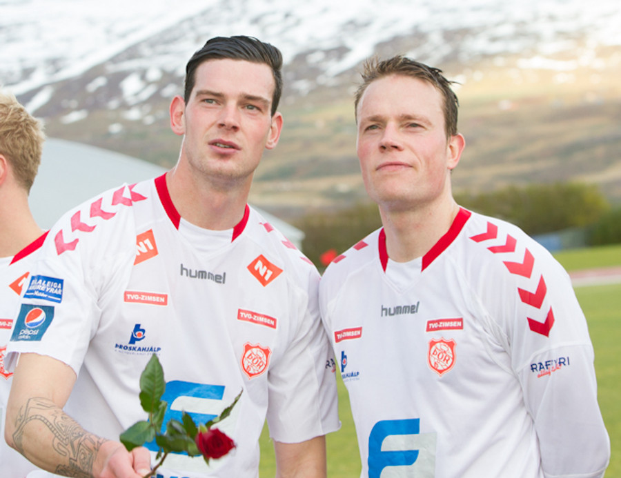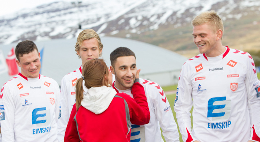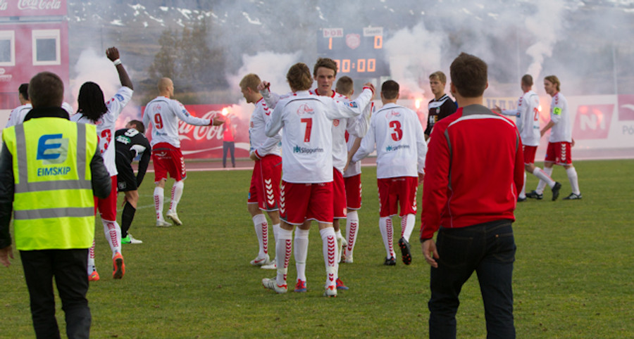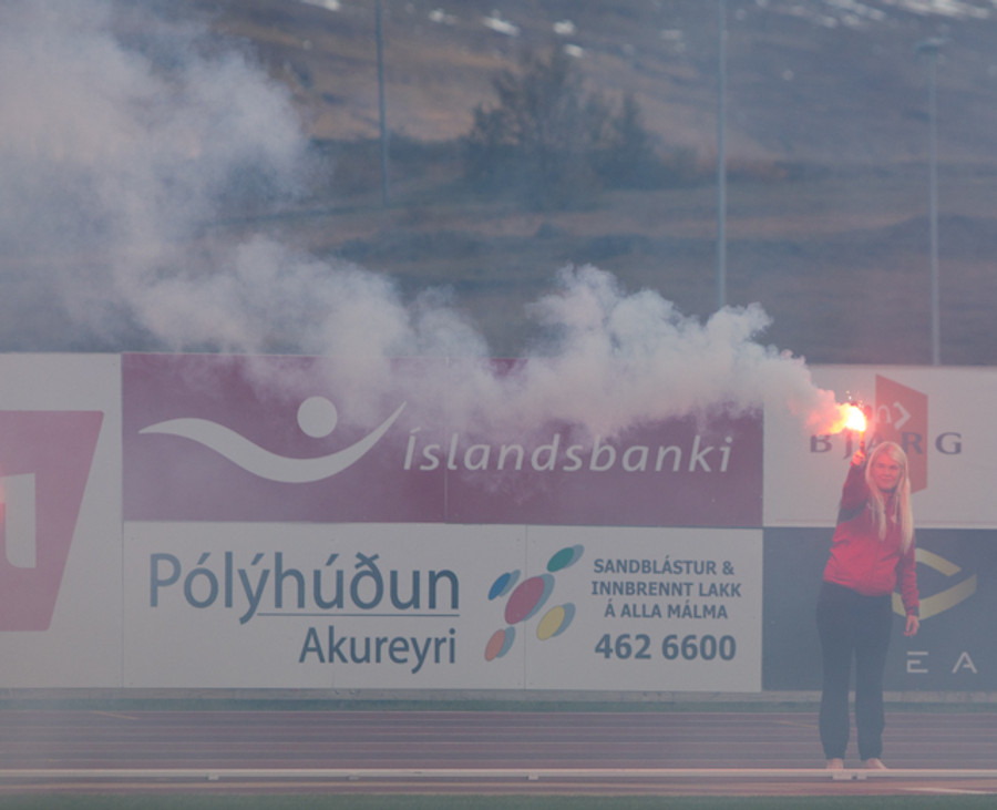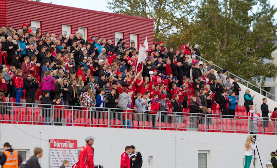 Það er nokkuð sérstök stemming hér á Þórsvellinum. Mjög létt yfir heimamönnum en það sama verður ekki sagt um gestina, þeir vilja losna við falldrauginn af bakinu.