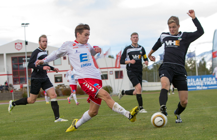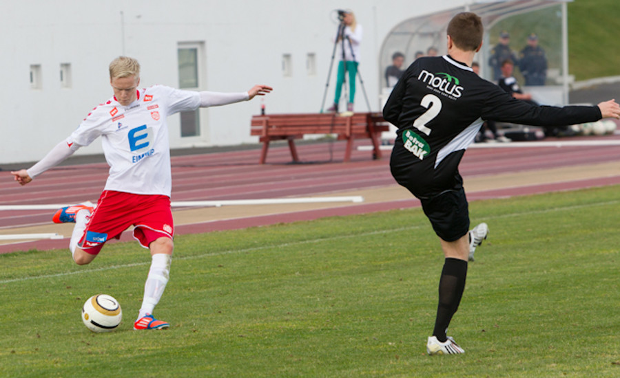 Elvar Þór Ægisson með skot af um 20-25 metra færi en boltinn fór nokkuð duglega yfir markið.