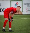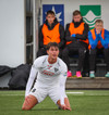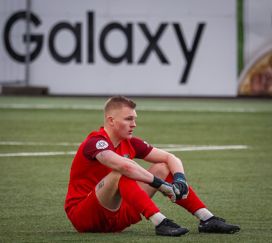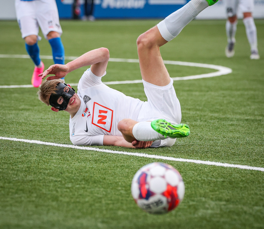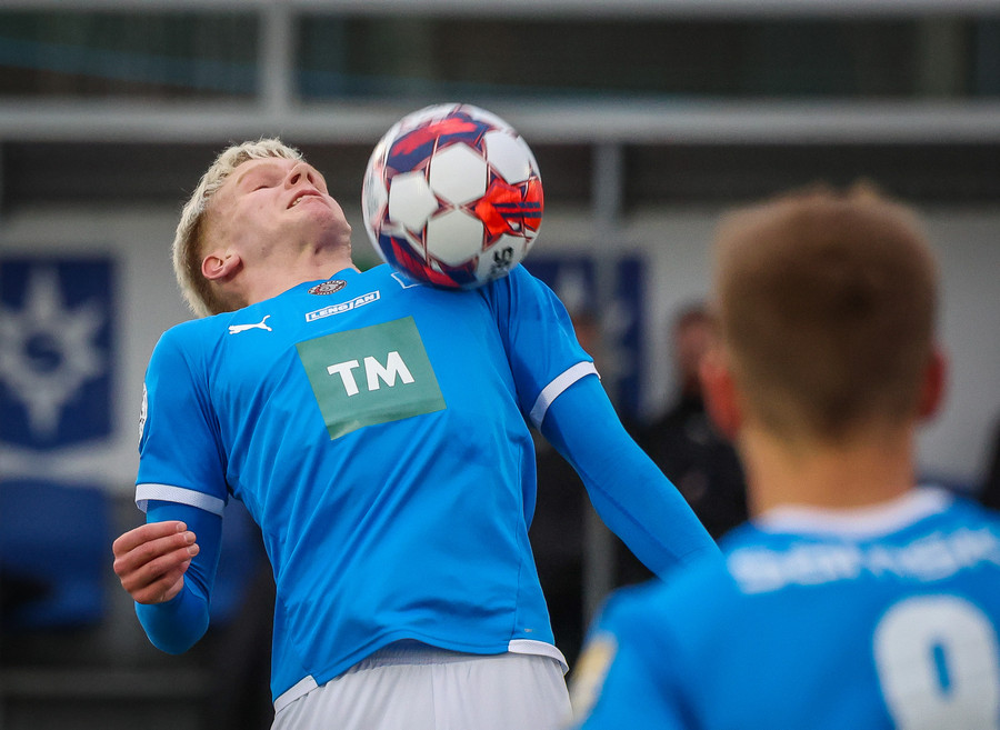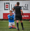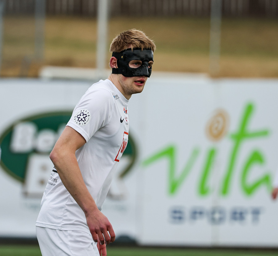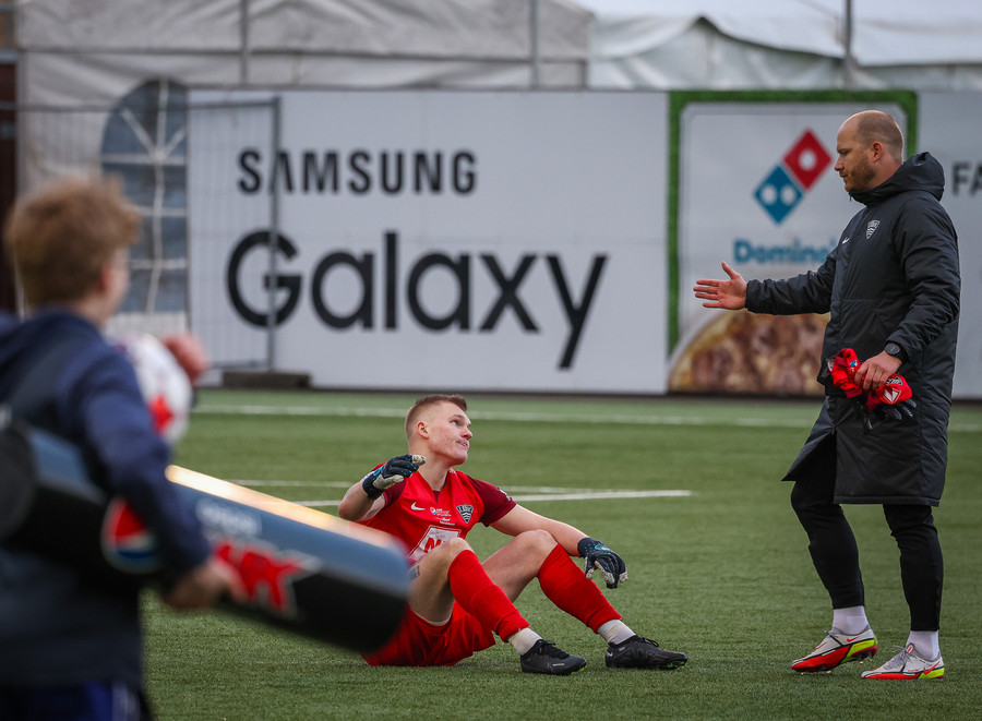 Leikurinn stöðvaður þar sem Sindri og Bjarki hoppa upp í skallabolta en enda á að skalla hvorn annan í stað boltans. Þeir standa báðir upp á endanum og virðast ætla að halda áfram leik.