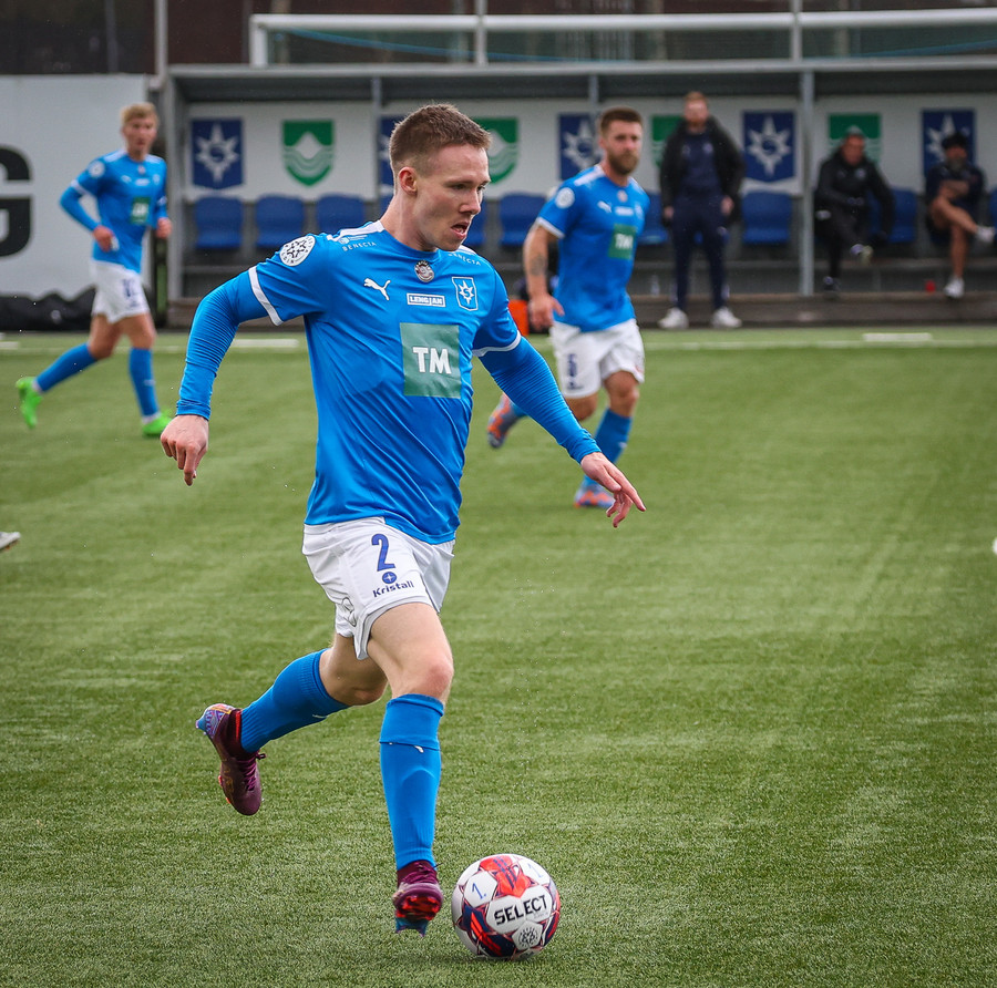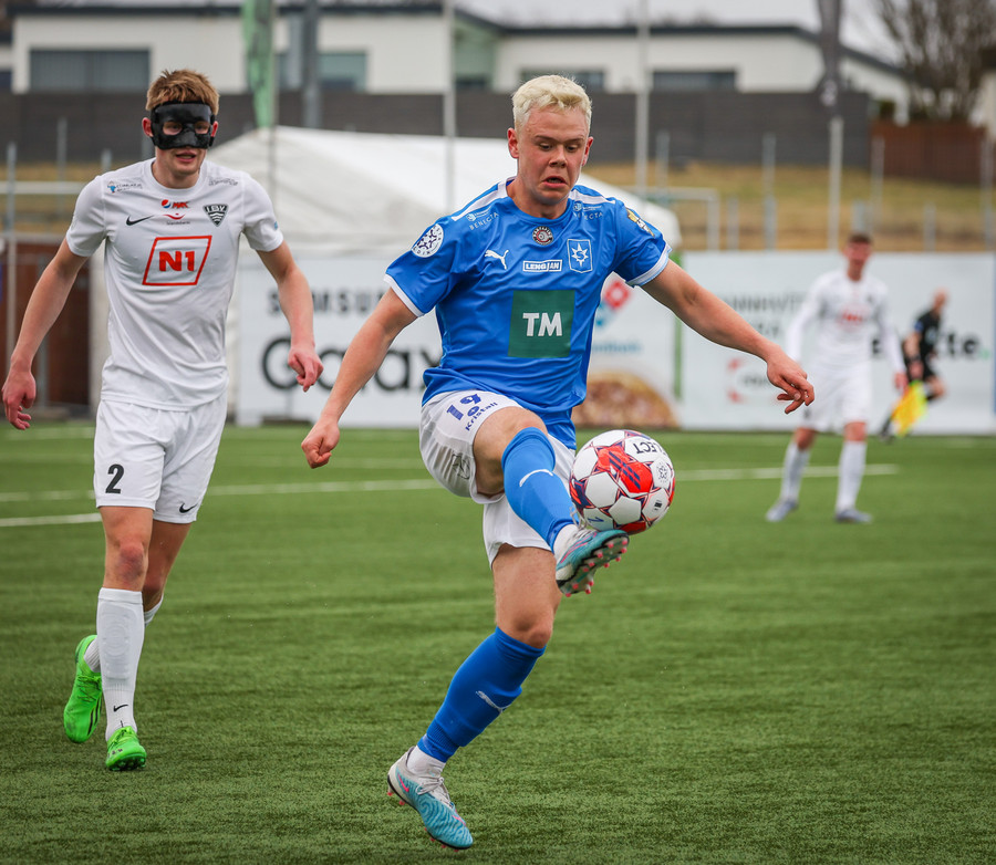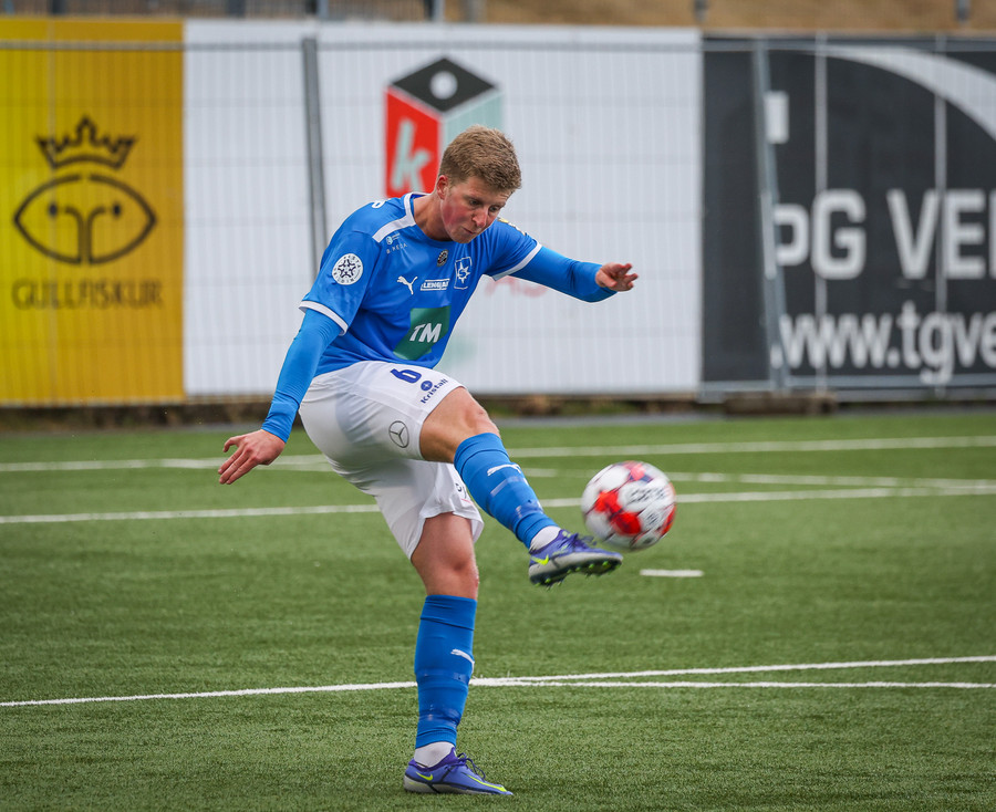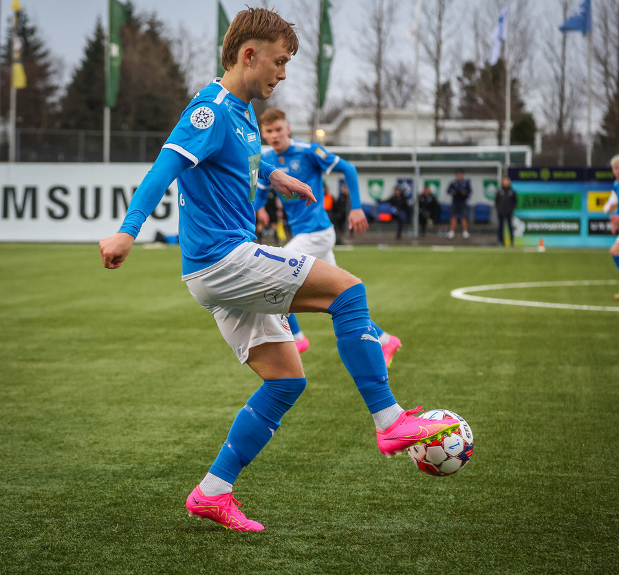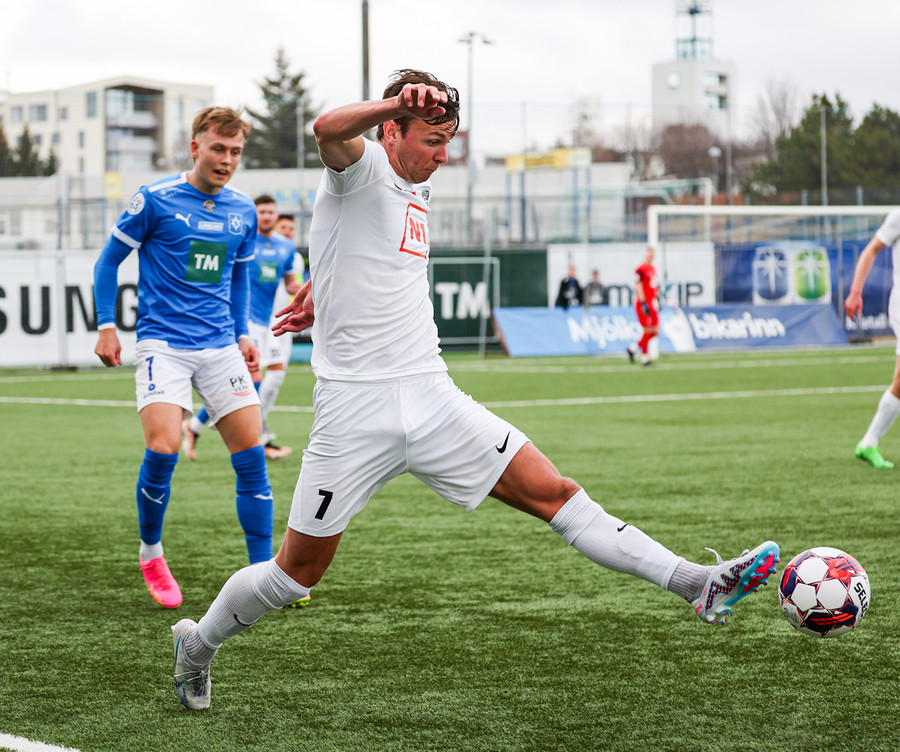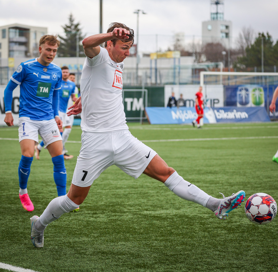 Kjartan hleypur upp vinstri kantinn og gerir mjög vel í að fara framhjá einum og setja svo boltan fyrir.