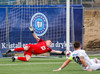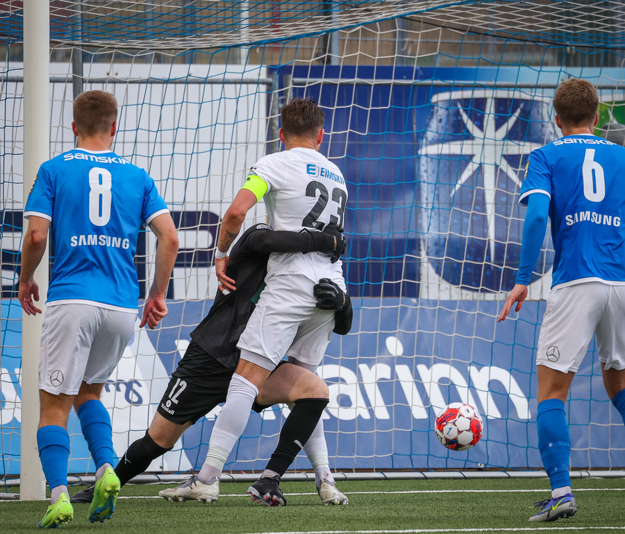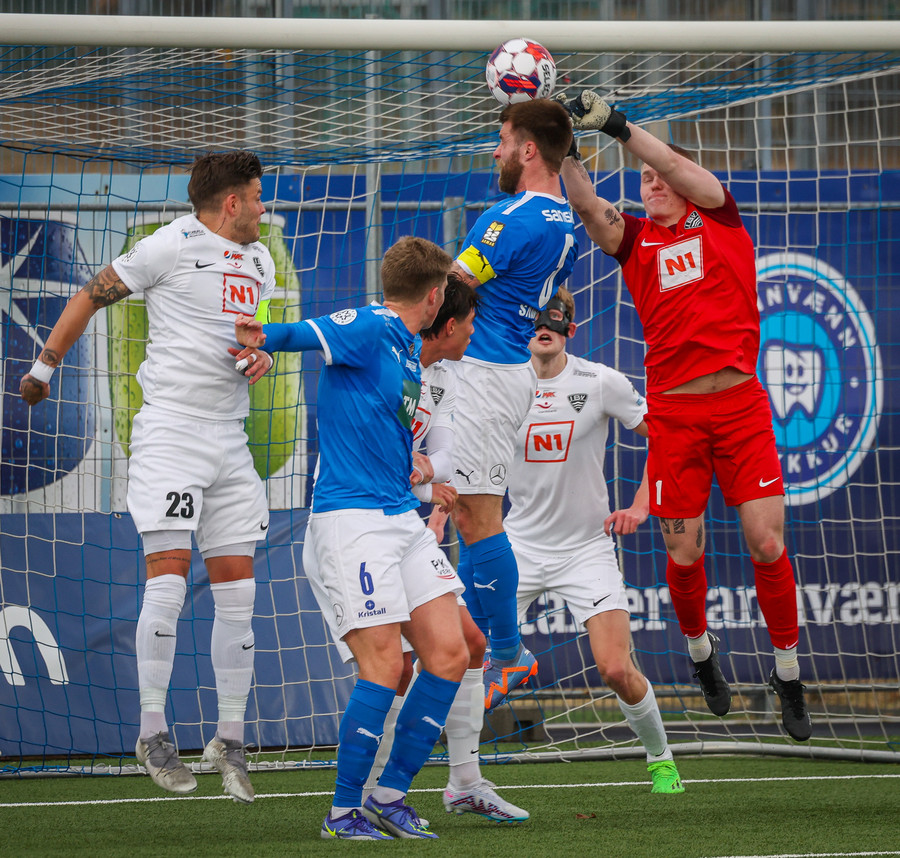 Jóhann Árni með stórhættulega hornspyrnu sem Jón Kristinn er í bullandi vandræðum með en nær að kíla boltan yfir markið.