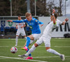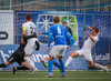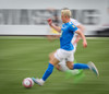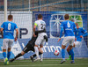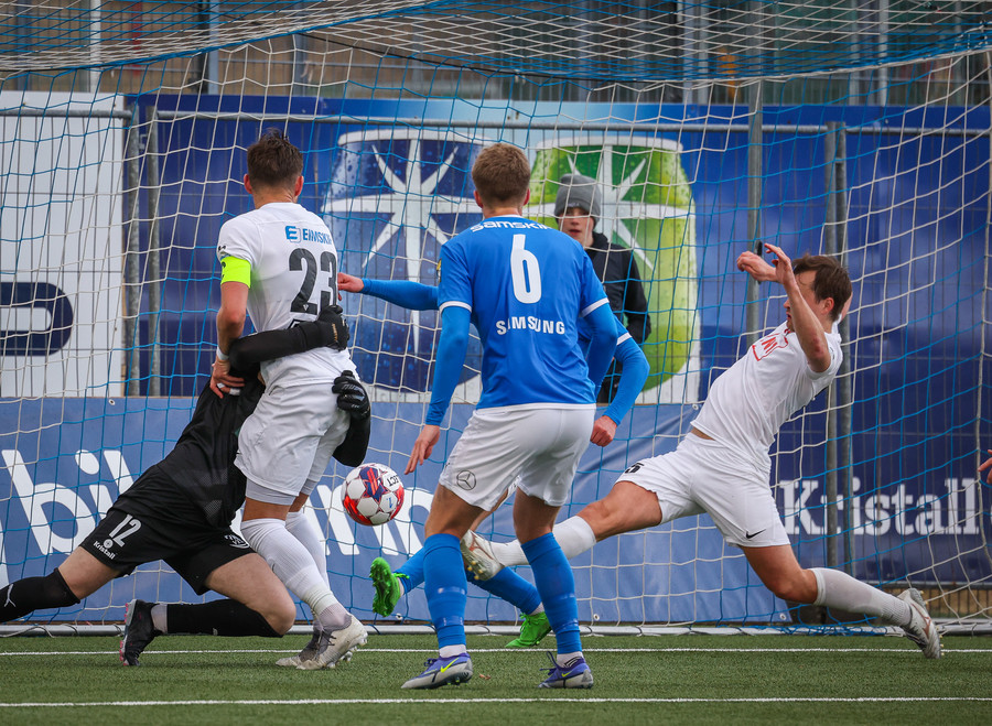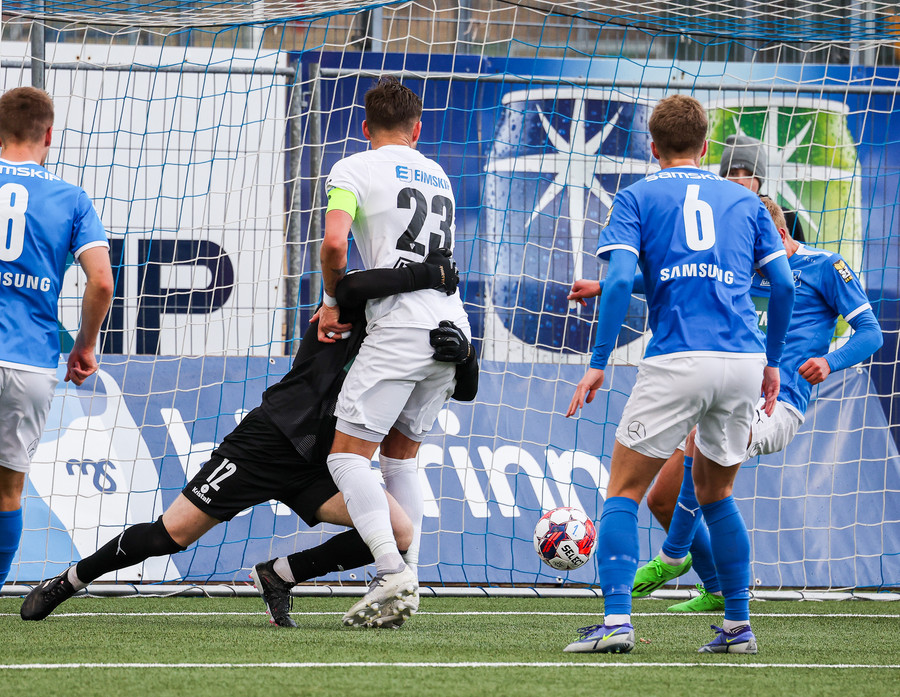 Eggert hleypur með boltan upp vinstri kantinn og kemur með frábæra sendingu fyrir markið en enginn bláklæddur er mættur til að pota boltanum í opið markið.