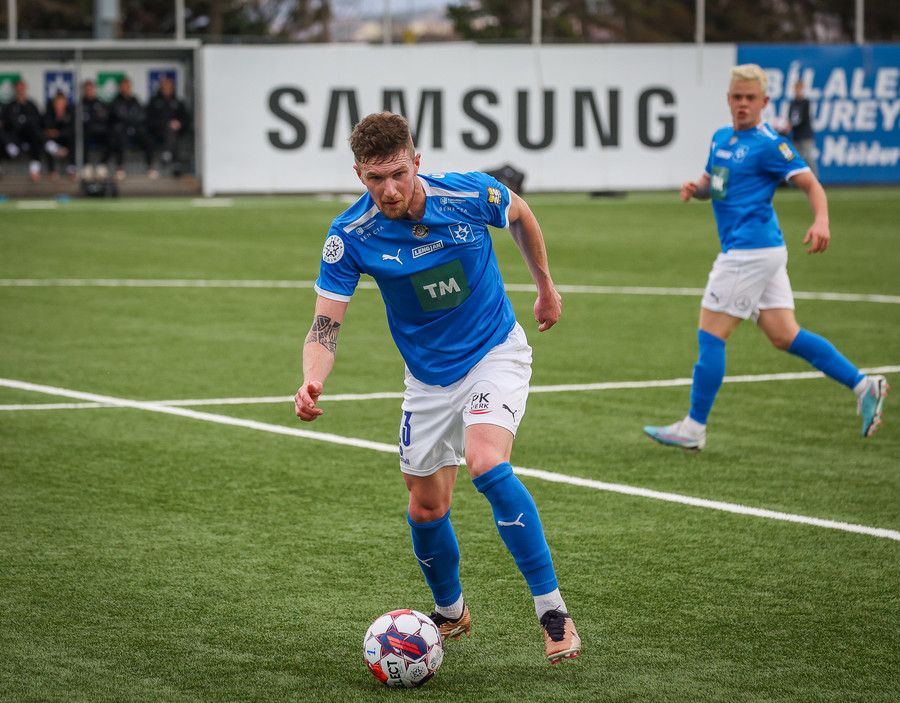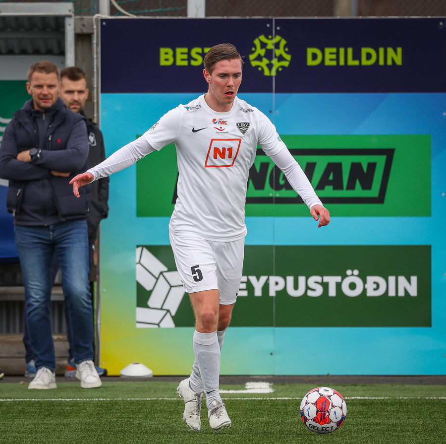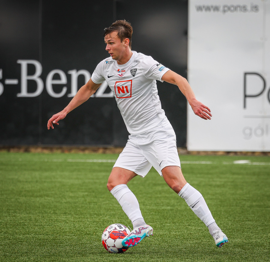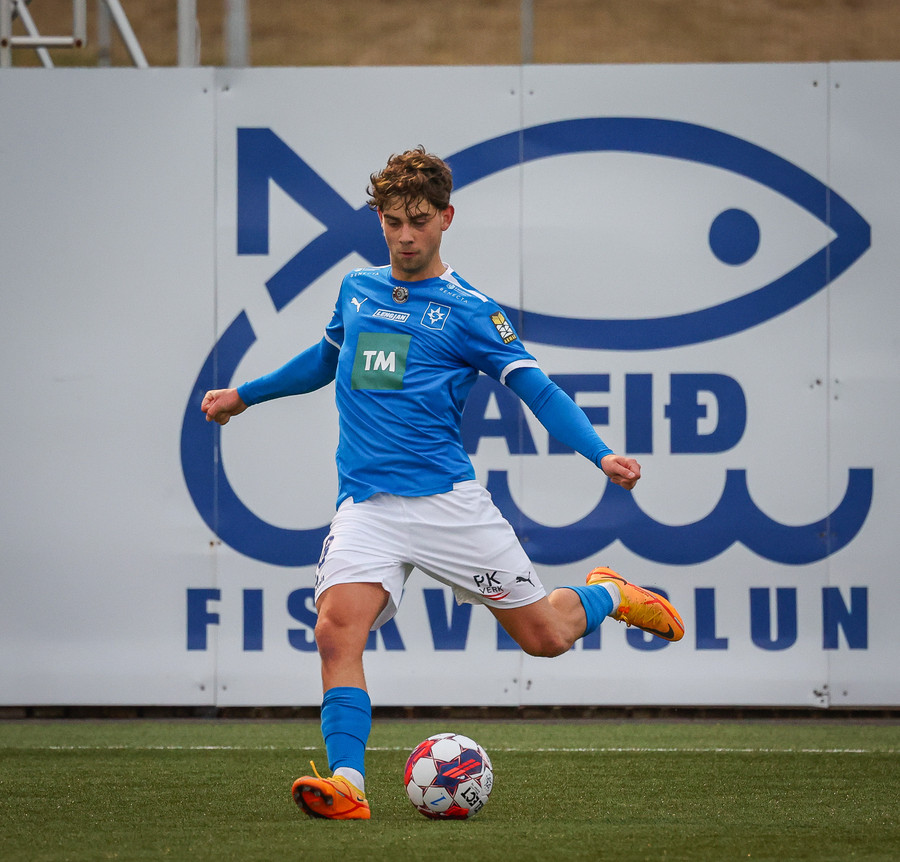 Ísak hleypur upp kantinn og kemur með góðan bolta fyrir en skotið frá Guðmundi varið og aftur er hornspyrna.