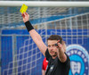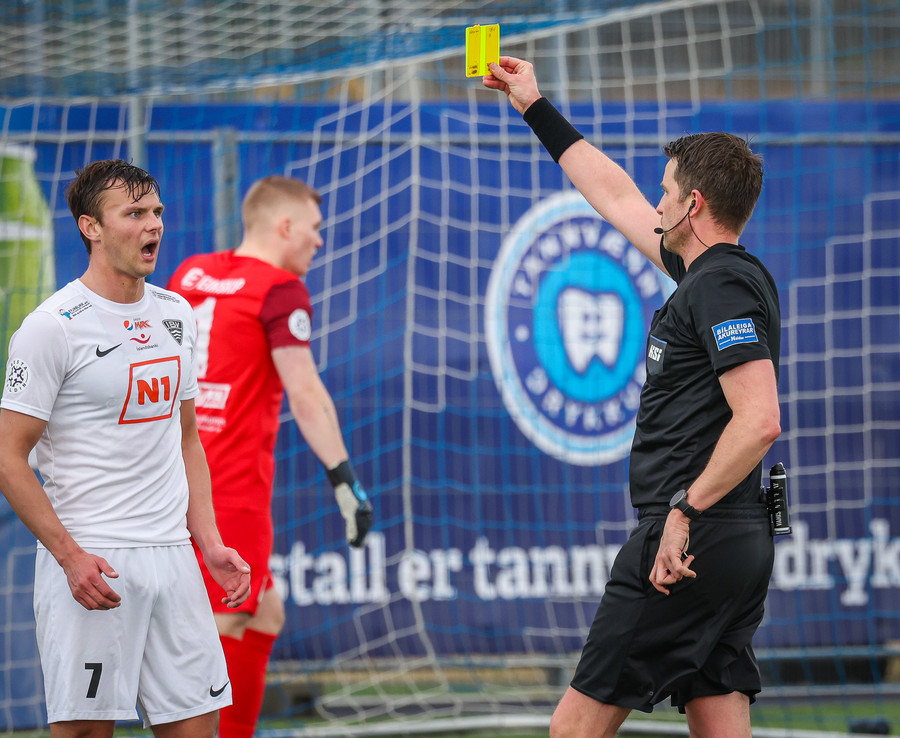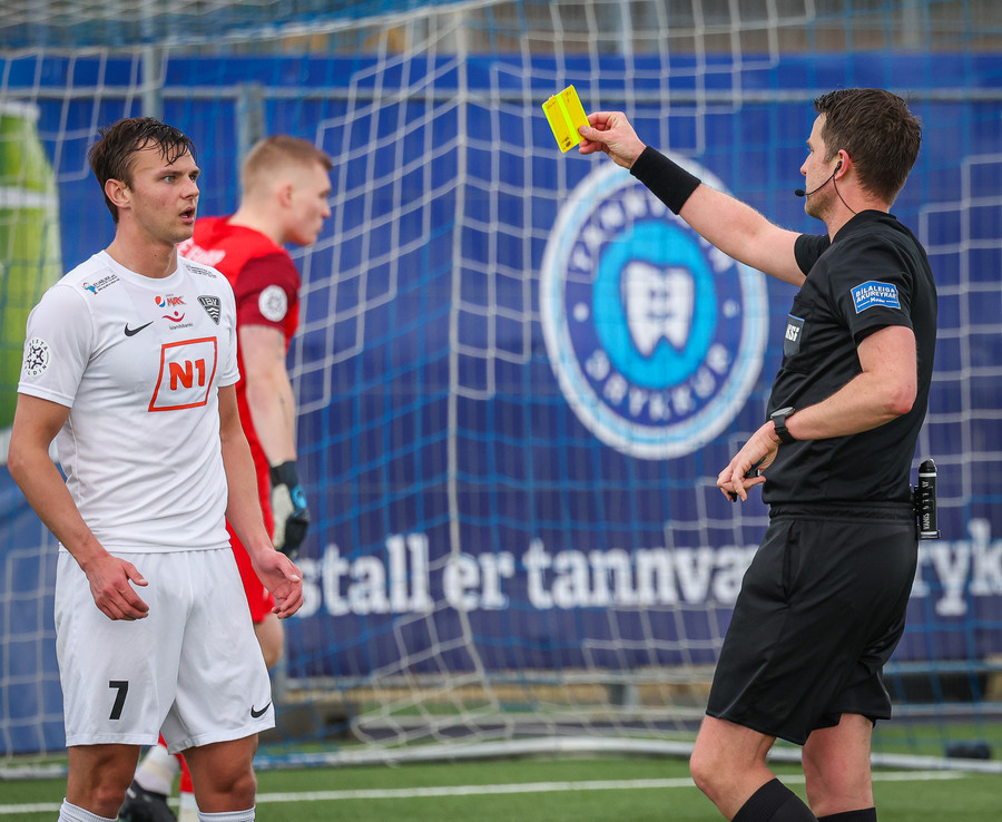 Bjarki er að fá sitt annað gula spjald hérna!