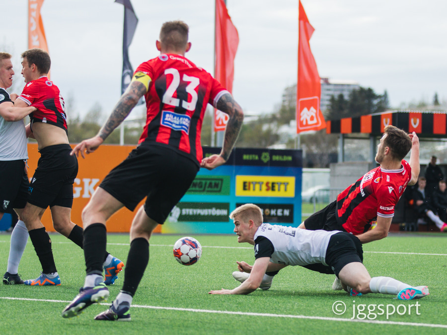 Vuk með boltann fyrir á Kjartan Henry en Gunnar Vatnhamar bjargar í horn á ögurstundu.