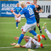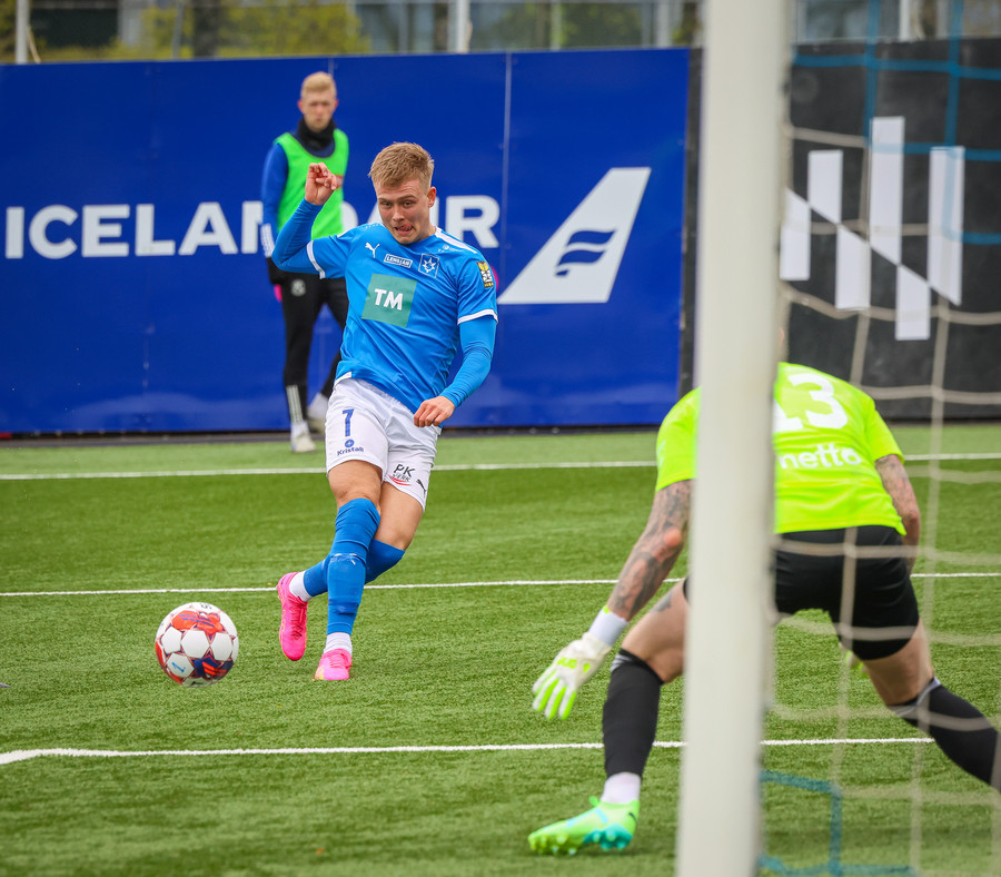 Ísak Andri svo nálægt því að skora en hittir boltann ílla og Mathias Rosenörn ver.