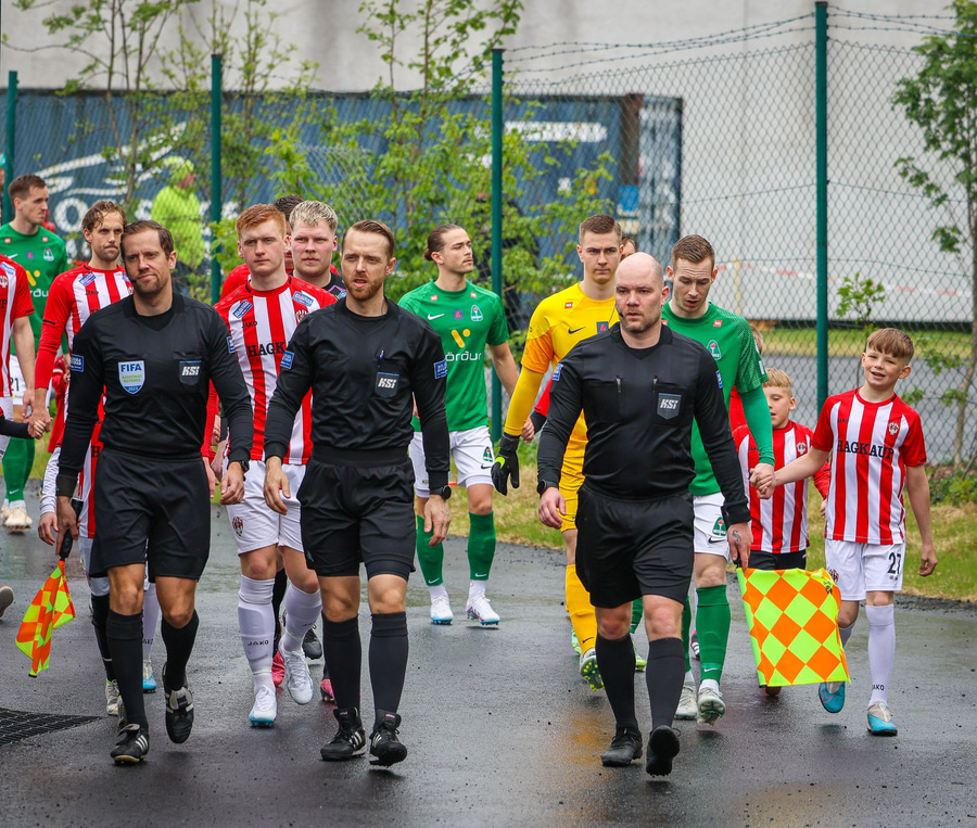 Einar Ingi flautar leikinn af stað og eru það heimamenn sem byrja með boltann.