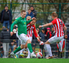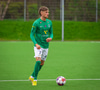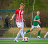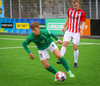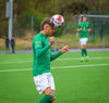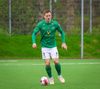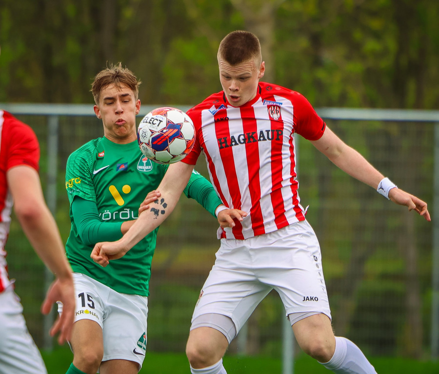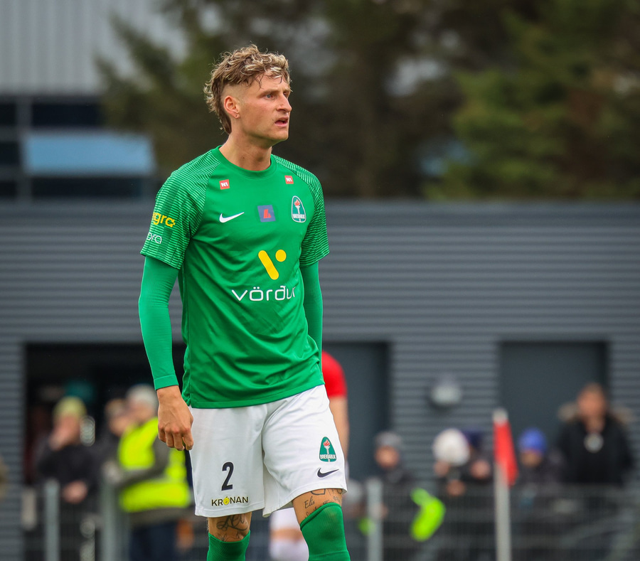 Jorgen Pettersen vinnur boltann hátt uppi á vellinum lætur vaða fyrir utan teig en boltinn fer í Oliver Stefáns og í horn.