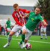Ágúst Hlynsson á skot sem fer rétt framhjá marki heimamanna.