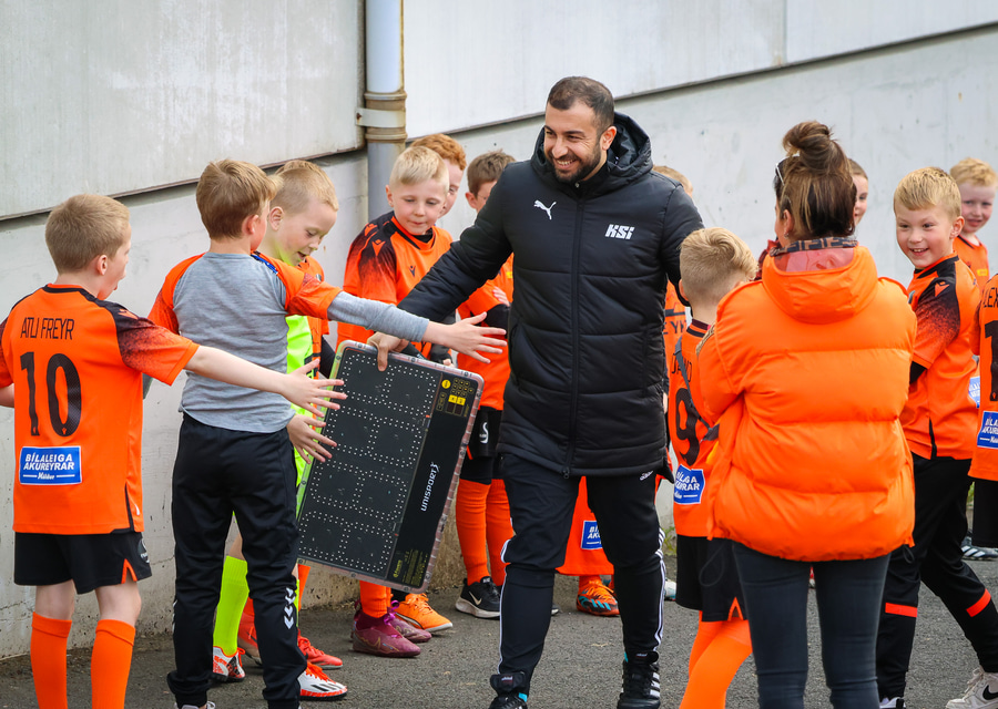 Bestu deildarstefið komið í gang, liðin ganga út á völlinn og Viktor Lekve vallarþulur kynnir liðin.