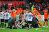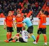 Leikurinn stöðvaður því leikmenn skella harkalega saman. Emil Ásmundsson og Finnur Tómas Pálmason liggja eftir. Skullu saman.