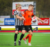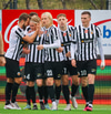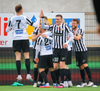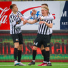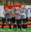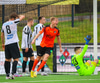 Pétur vippar yfir Aron í markinu og í þverslána, Þórður mætir svo og hirðir frákastið og skorar! Vestfirska samvinnan.