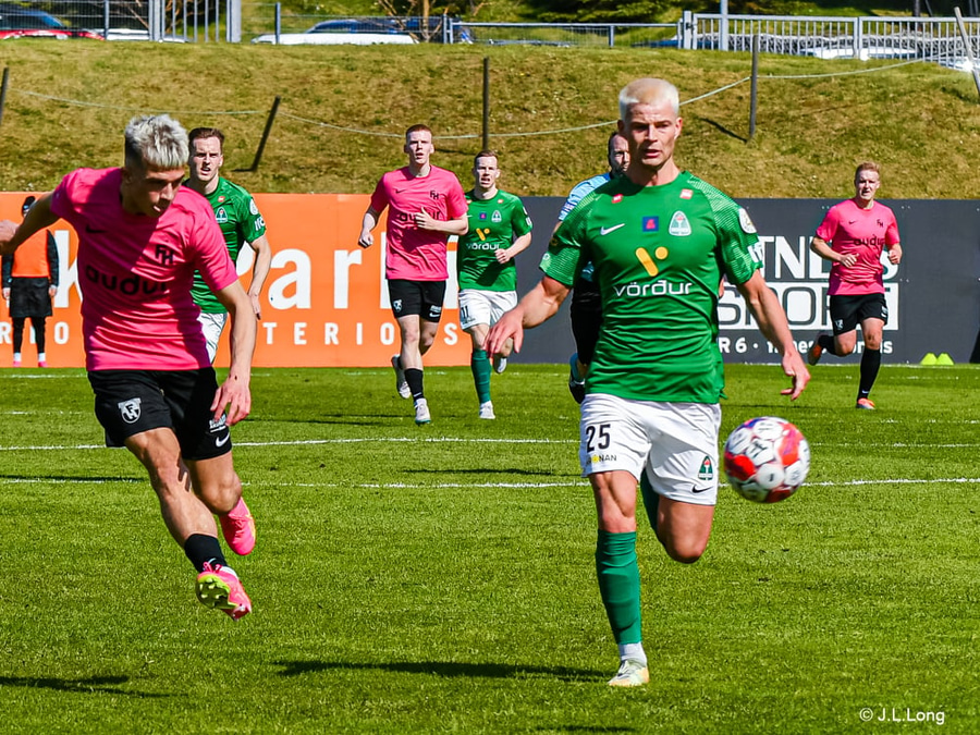 Gíslli Eyjólfs finnur Klæmint í gegn og setur boltann í slánna og niður en Klæmint flaggaður rangstæður svo þetta hefði ekki talið.