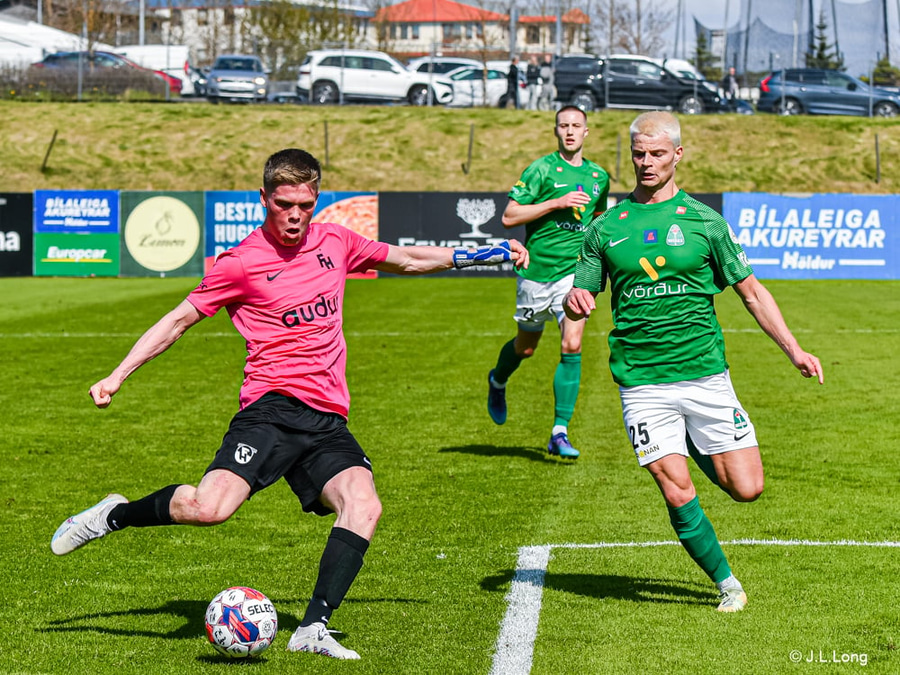 Höskuldur tekur spyrnuna en FHingar koma boltanum í burtu.