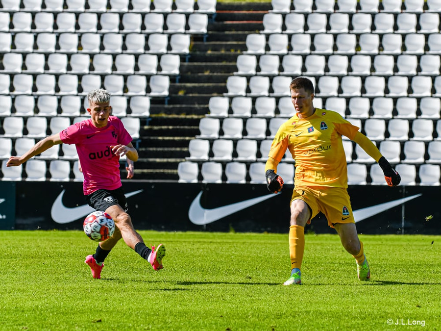 Kjartan fær boltann út til hægri og keyrir af stað inn á teiginn og Davíð Ingvars eltir hann uppi og þrengir skotvínkilinn fyrir Kjartan sem setur boltann í hliðarnetið.