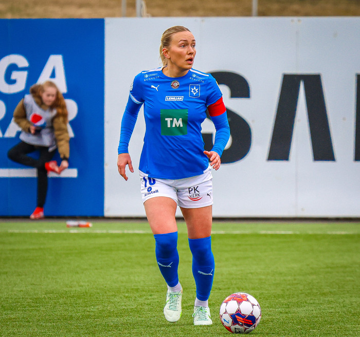 Betsy Hasset í dauðafæri en Mikaela Nótt gerir gríðarlega vel í að vinna sig framfyrir hana og komast fyrir skot hennar.