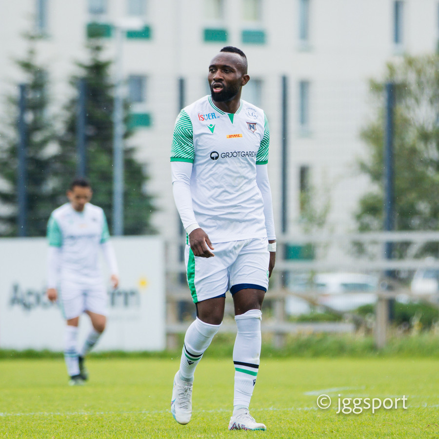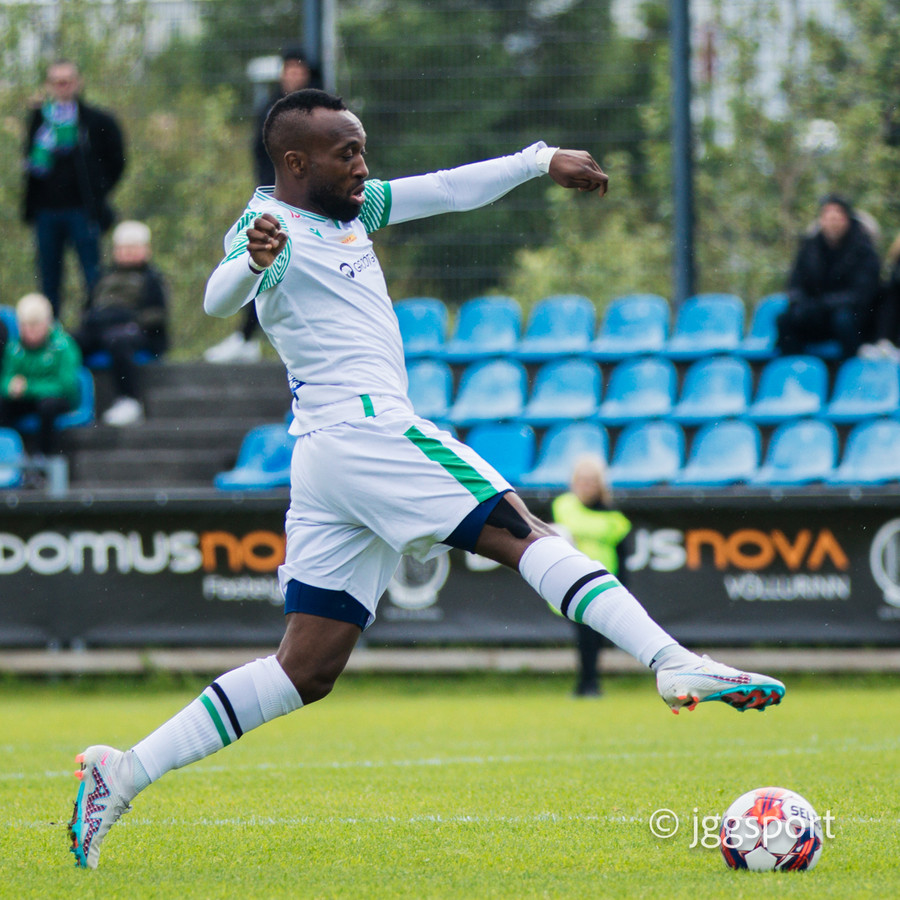 Oumar Diouck sýnir gríðarlegan styrk og tekur á rás frá miðju nánast og keyrir í átt að marki Leiknismanna en skotið rétt framhjá.