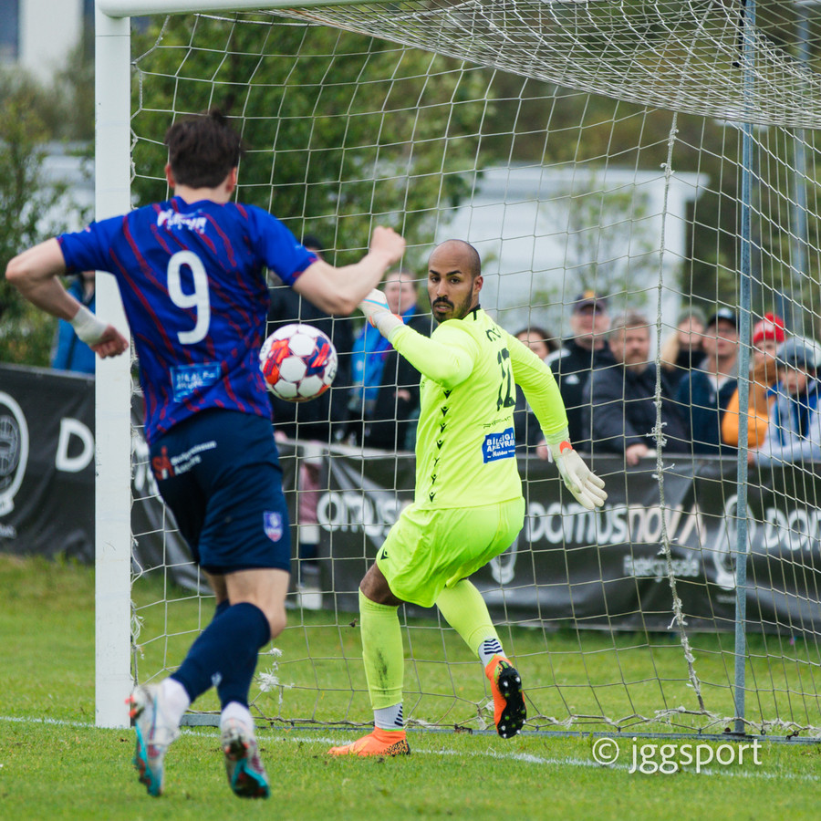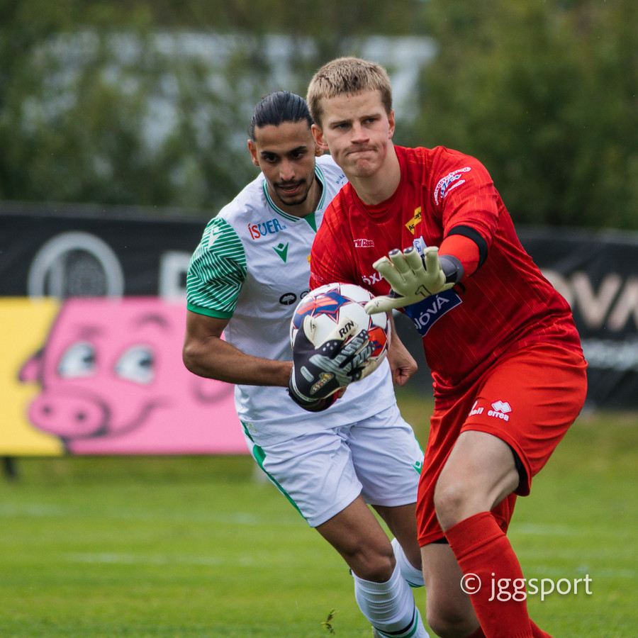 Njarðvíkingar með langan bolta fram sem Oumar Diocuk er öskufjótur að elta en Viktor Freyr kemur út á móti og nær að trufla hann.
