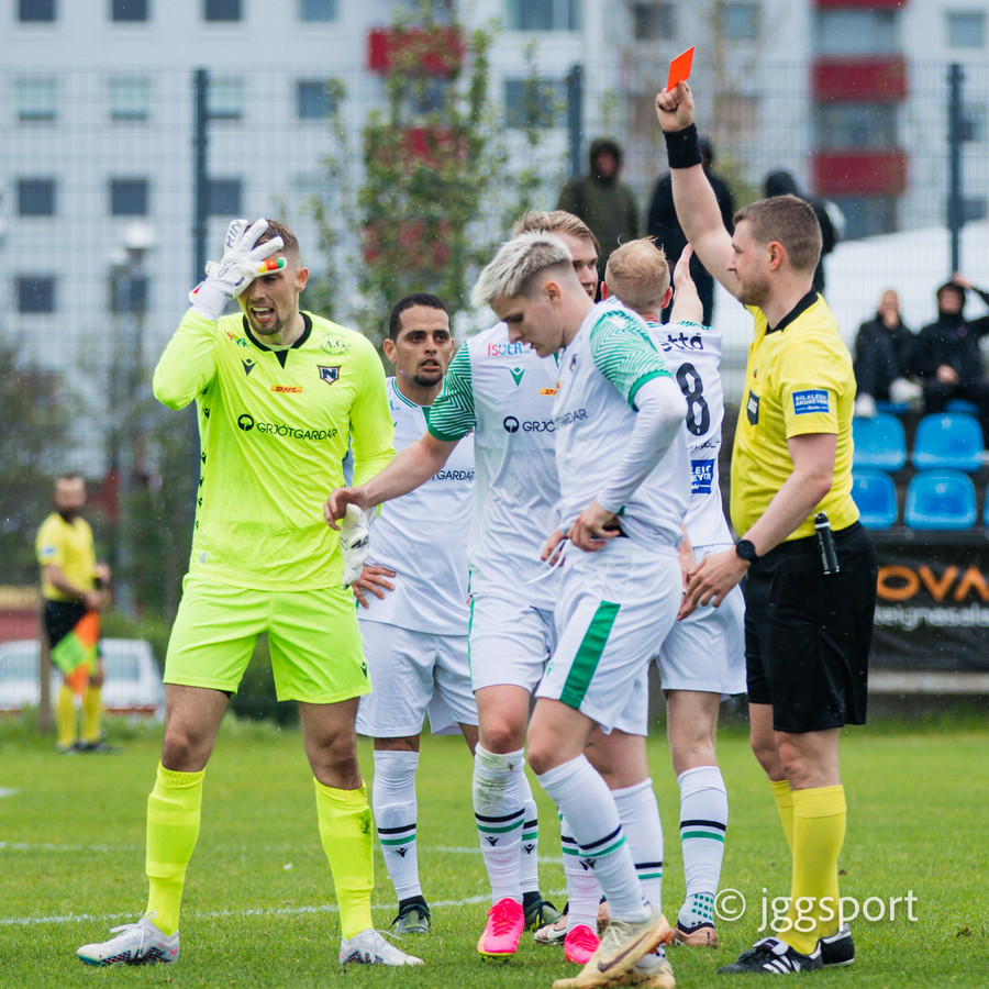 Omar Sowe er stungið í gegn og Robert Blakala kemur út á móti og tæklar klárlega boltann fyrst og fer svo af Omar og útaf.