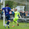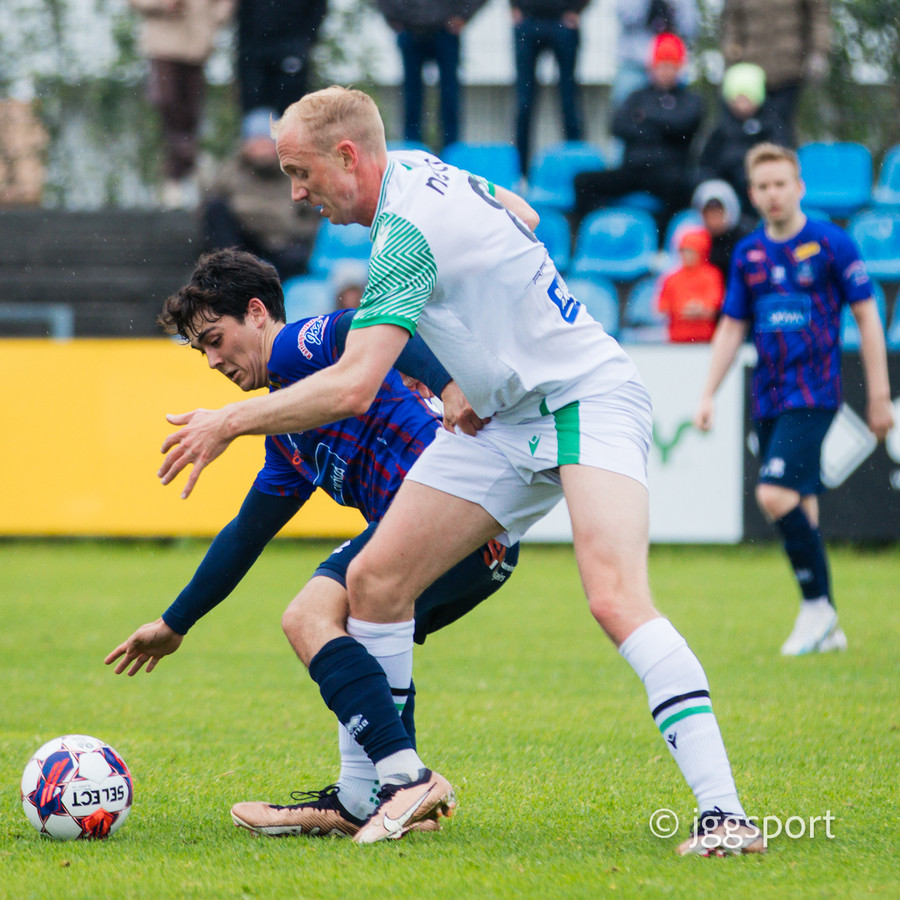 Marko Zivkovic finnur Róbert Hauks í teignum sem langar að komast í skotfæri en fellur við í teignum en Elías Ingi segir honum bara að standa upp.