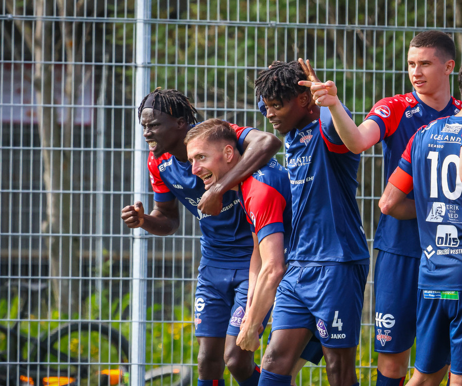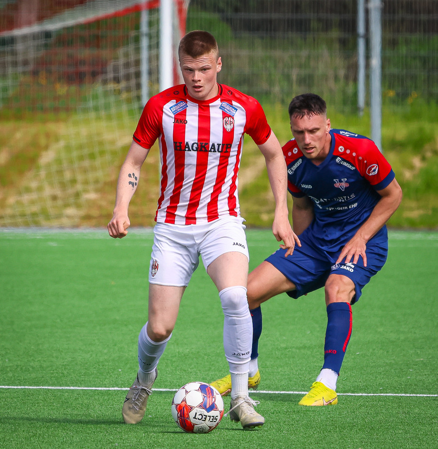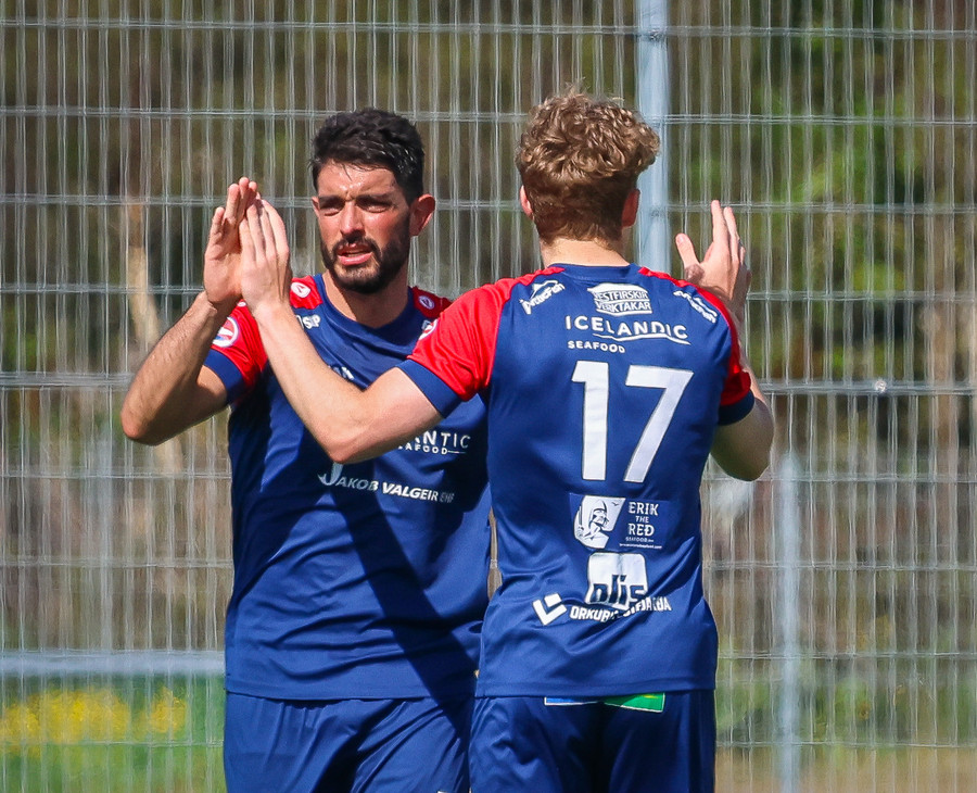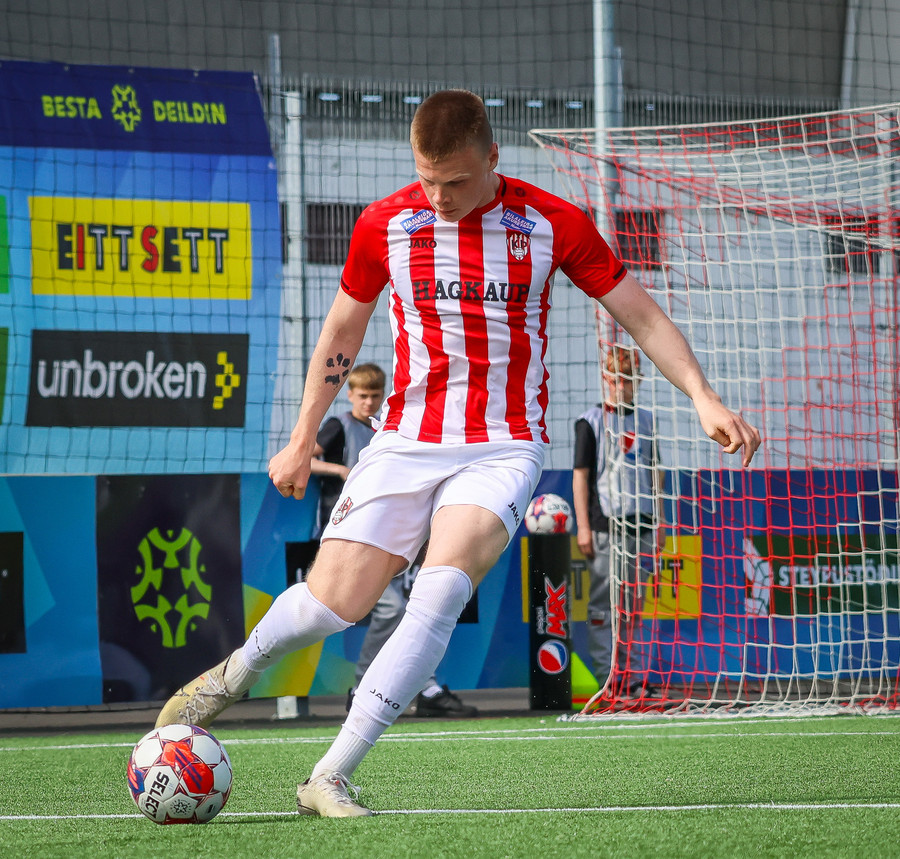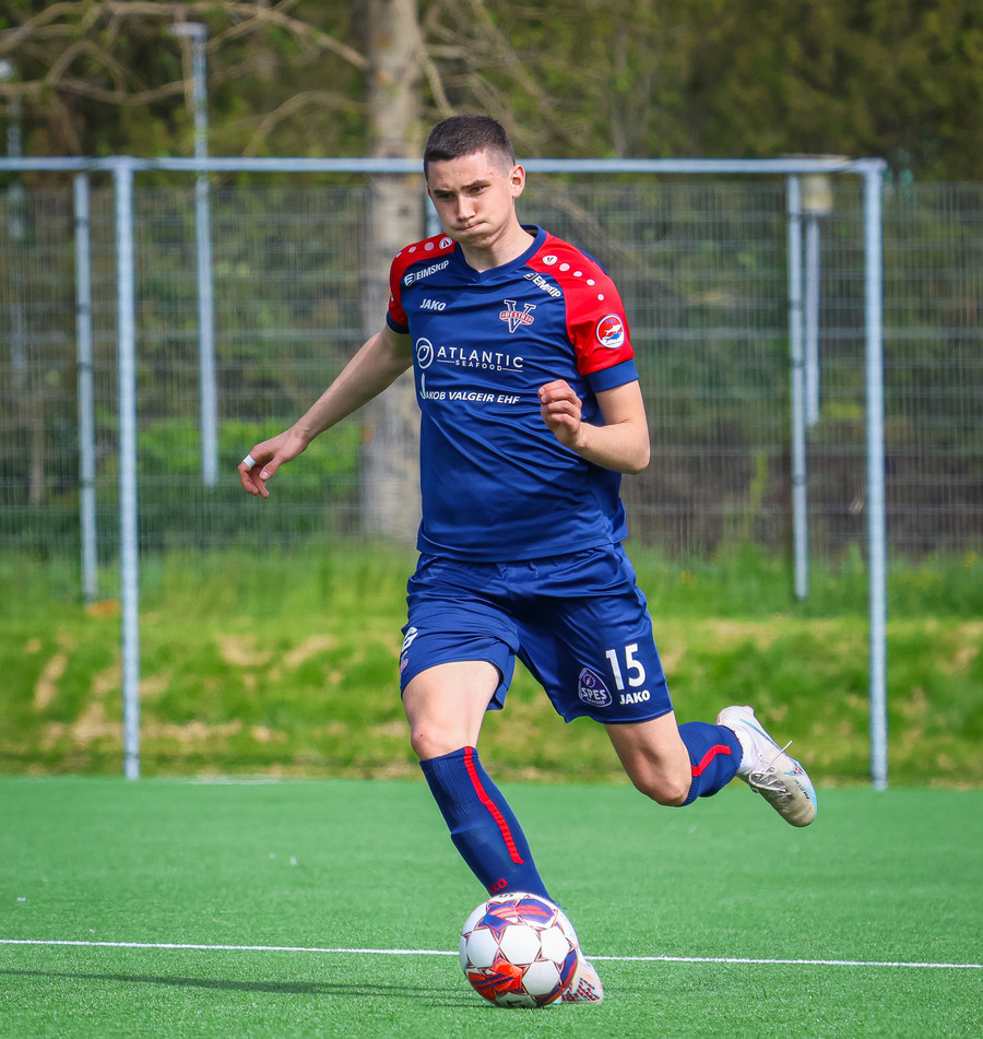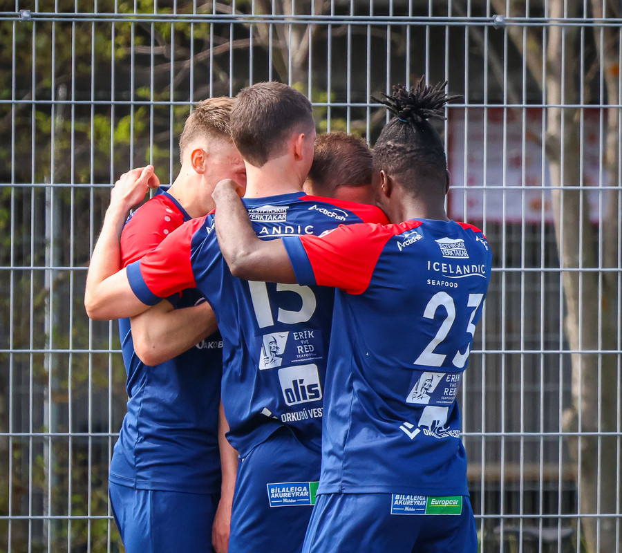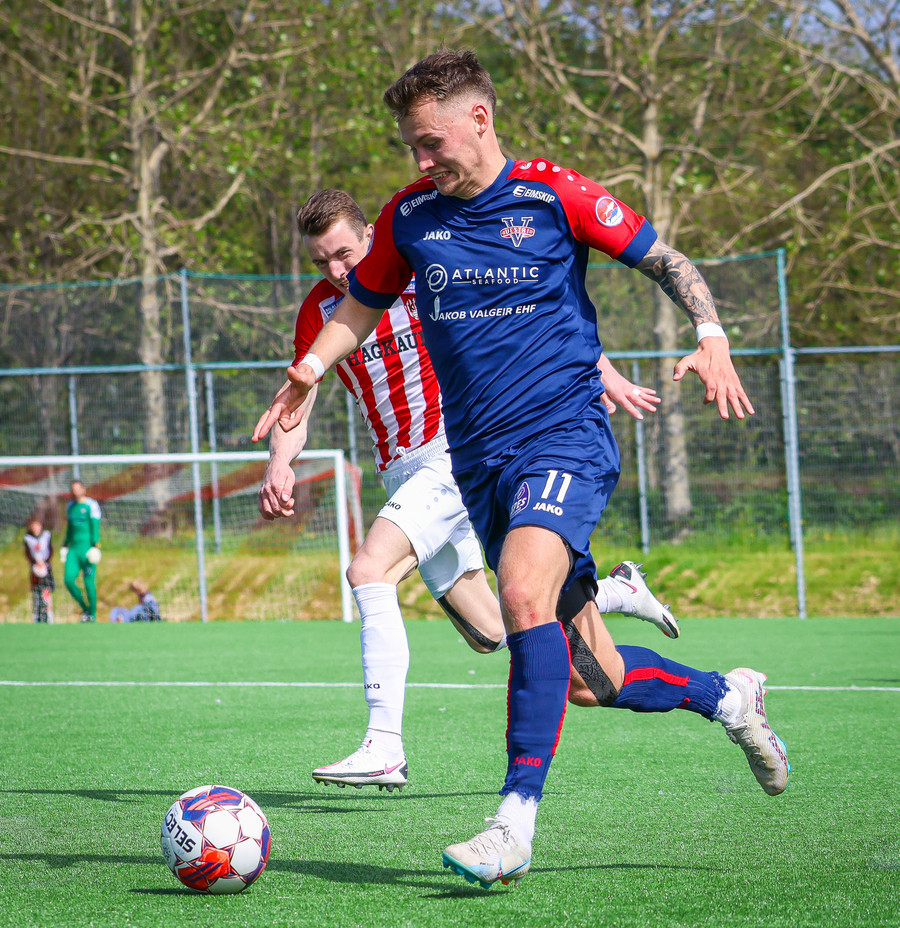 Jörgen gerir vel úti vinstra meginn leggur boltann svo út á Ágúst Karel sem kemur með gull af fyrirgjöf á fjærstöngina þar Aron Snær rís hæst og stangar þetta inn.