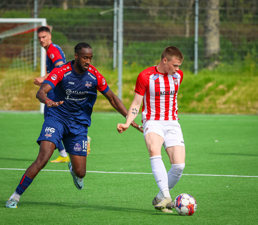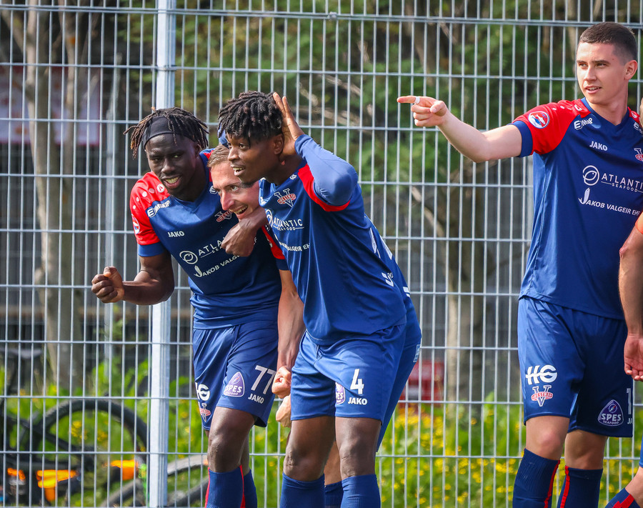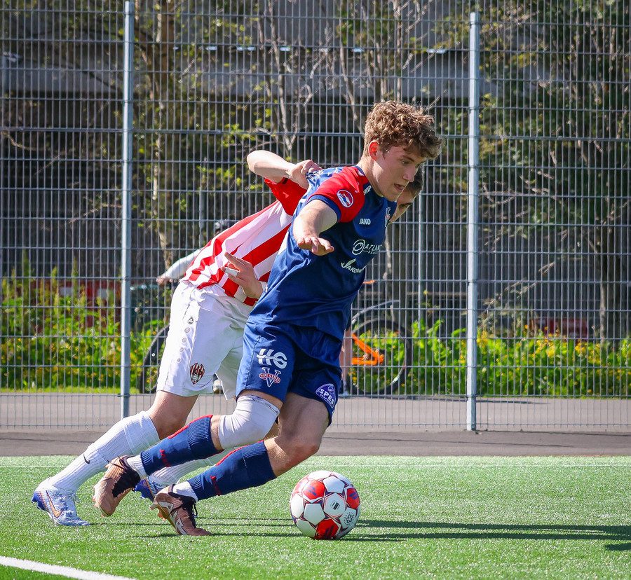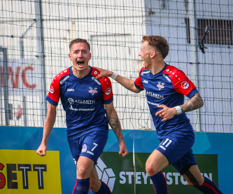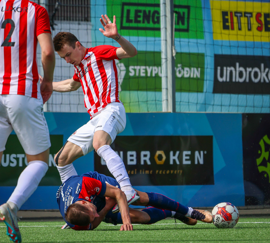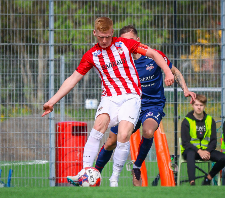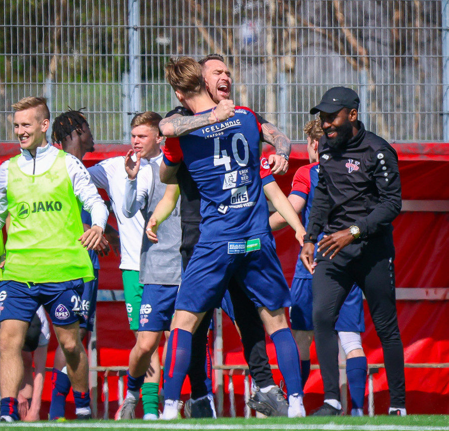 Jörgen gerir vel úti vinstra meginn leggur boltann svo út á Ágúst Karel sem kemur með gull af fyrirgjöf á fjærstöngina þar Aron Snær rís hæst og stangar þetta inn.