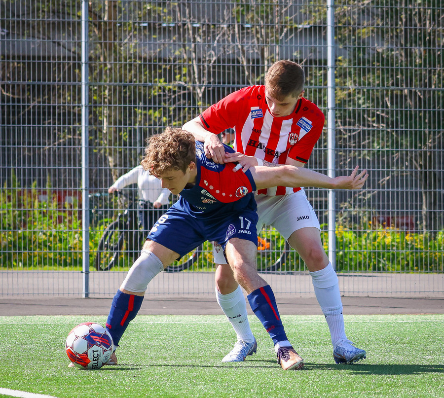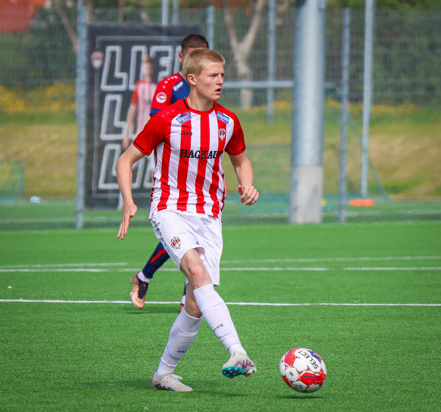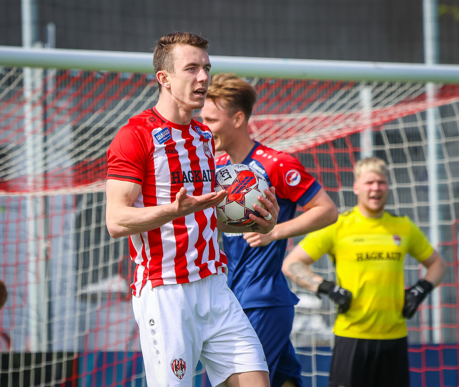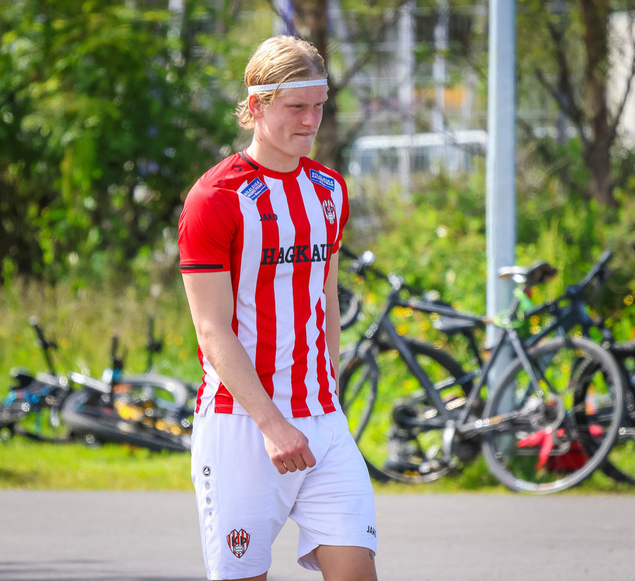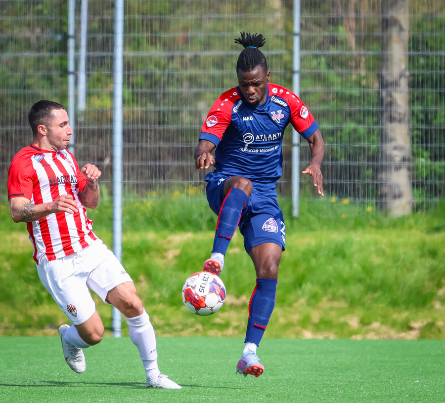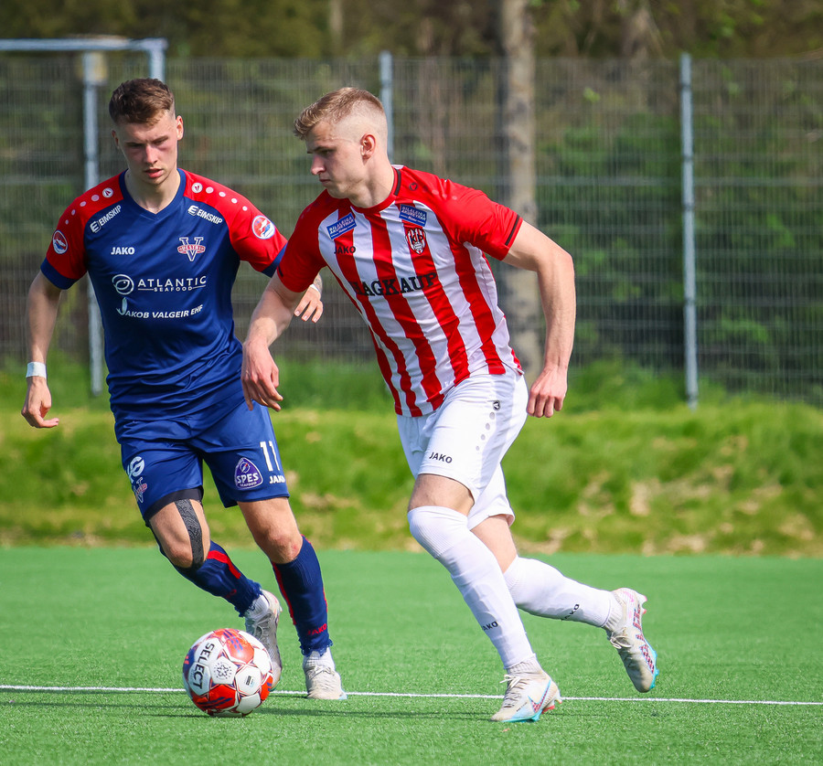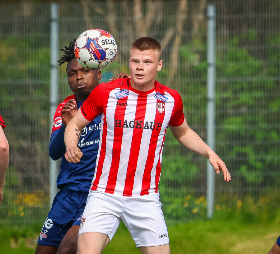 Jörgen gerir vel úti vinstra meginn leggur boltann svo út á Ágúst Karel sem kemur með gull af fyrirgjöf á fjærstöngina þar Aron Snær rís hæst og stangar þetta inn.
