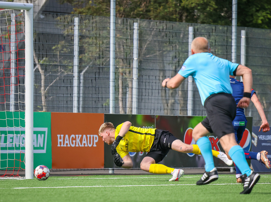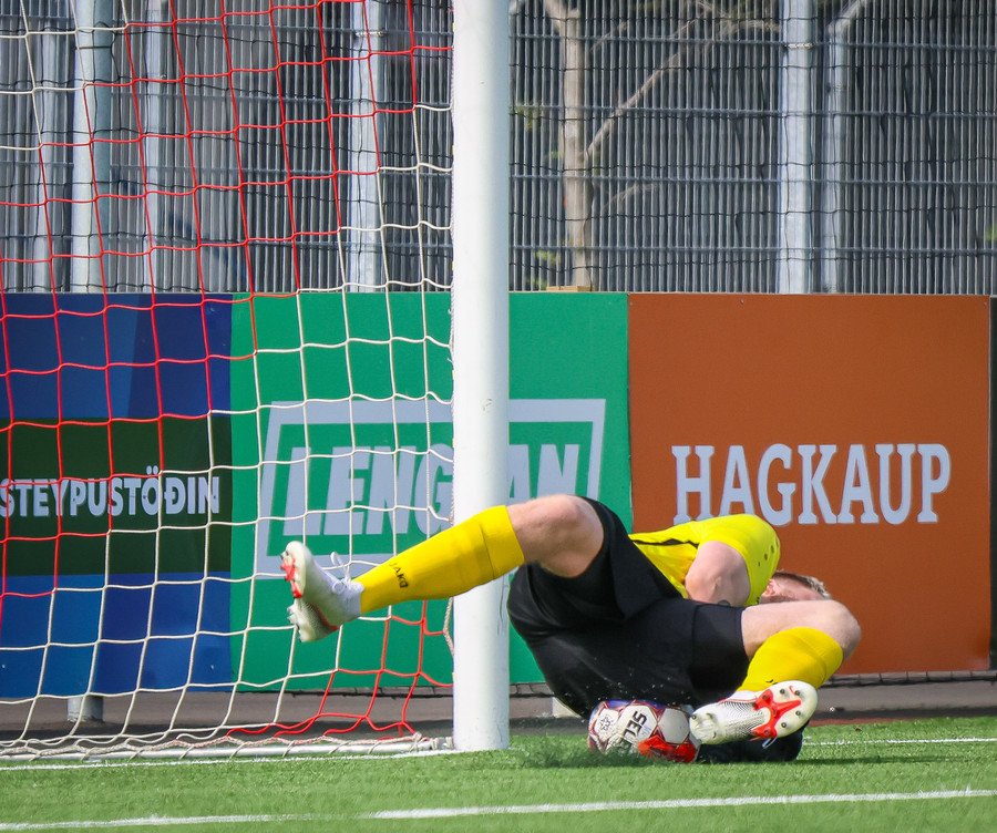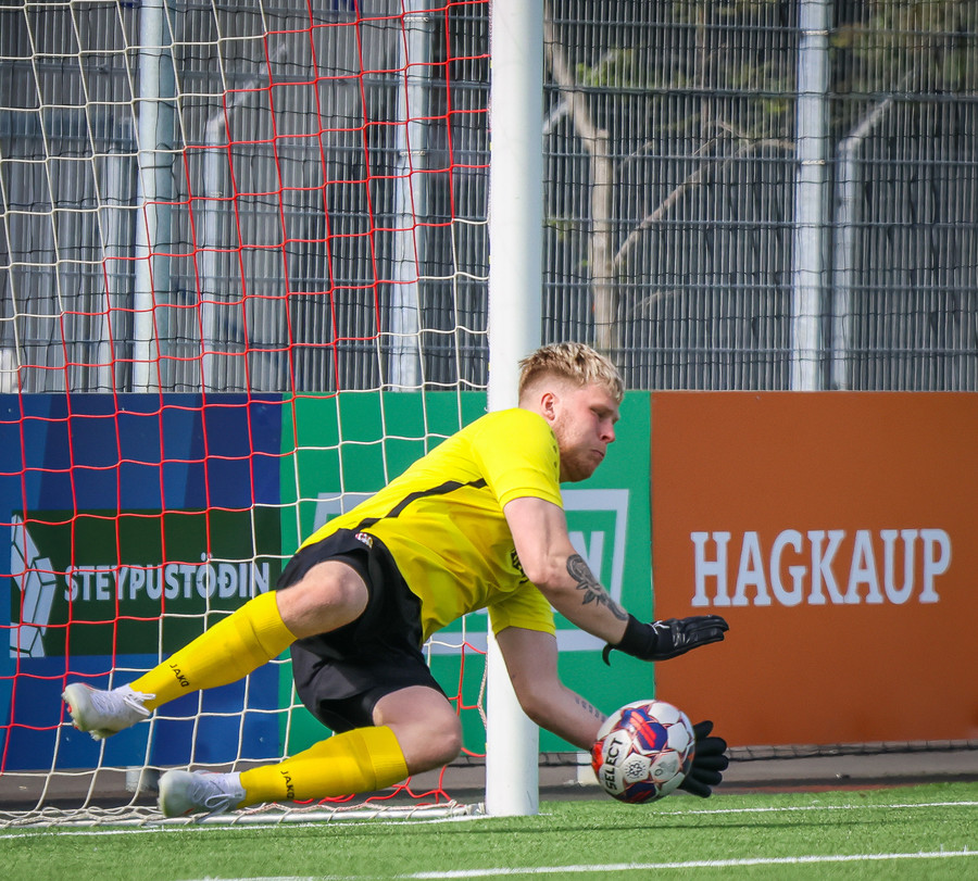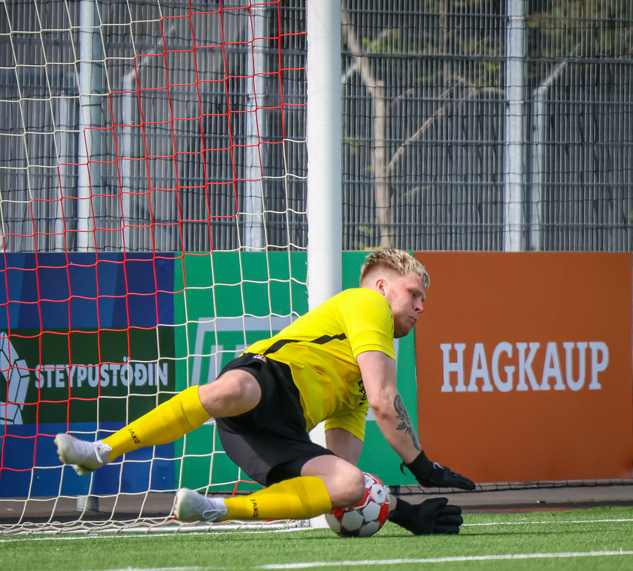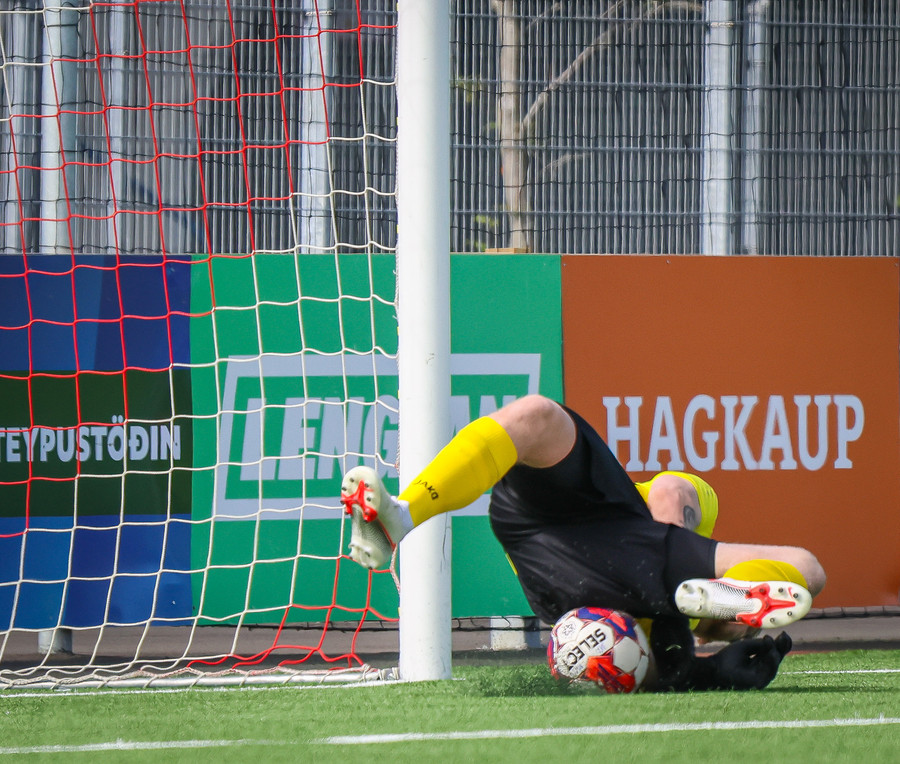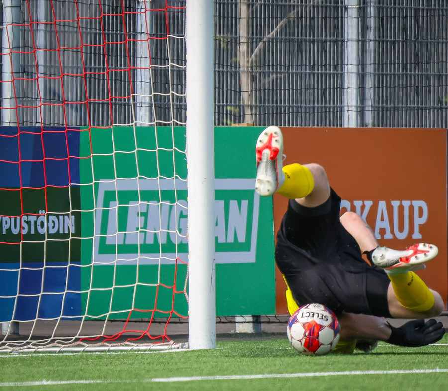 Túfa með vítið sem er slakt. Sveinn Óli ver og handsamar þetta og missir hann svo ansi klaufalega í netið. Sprellimark!