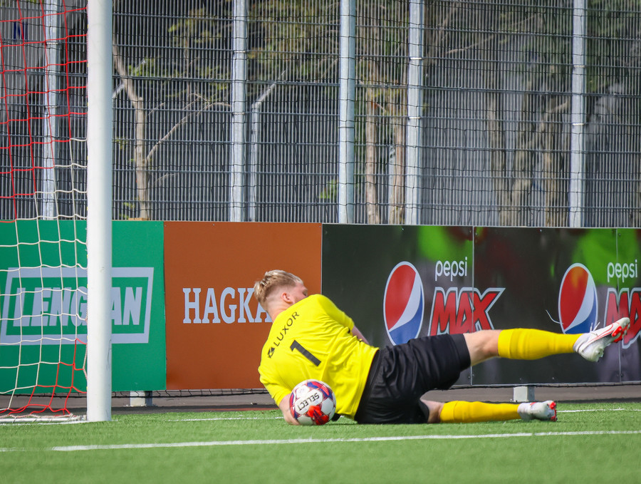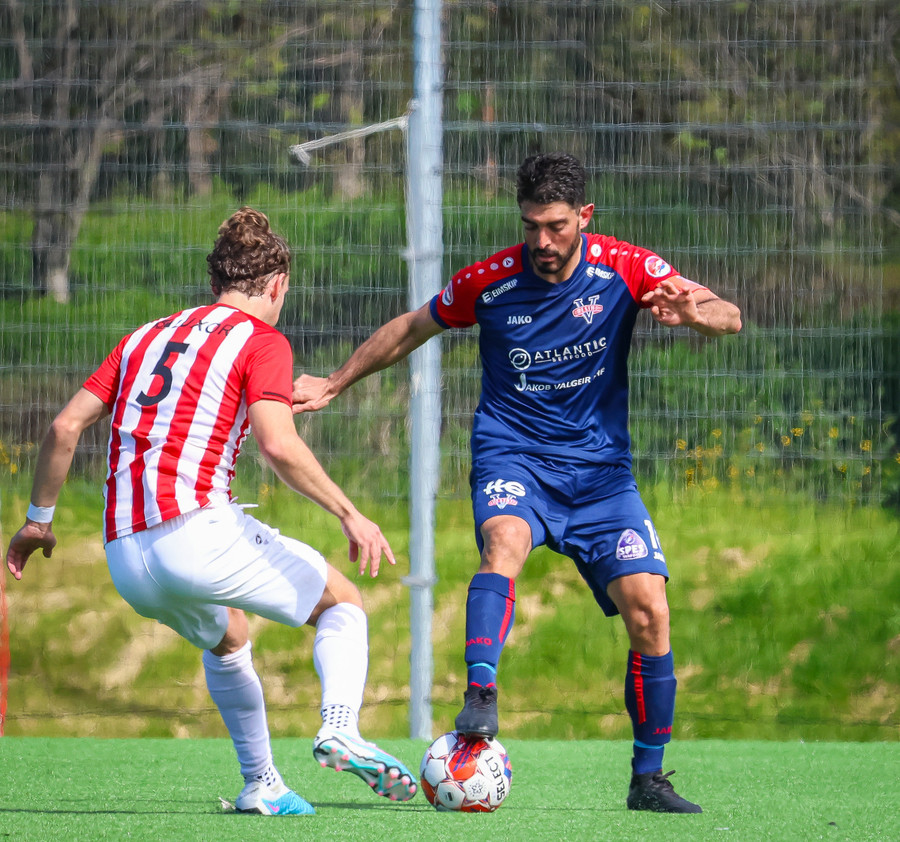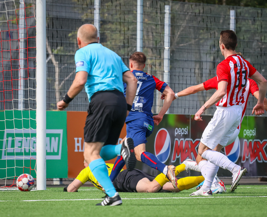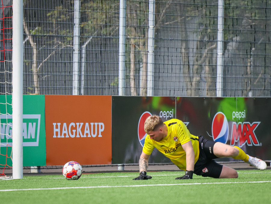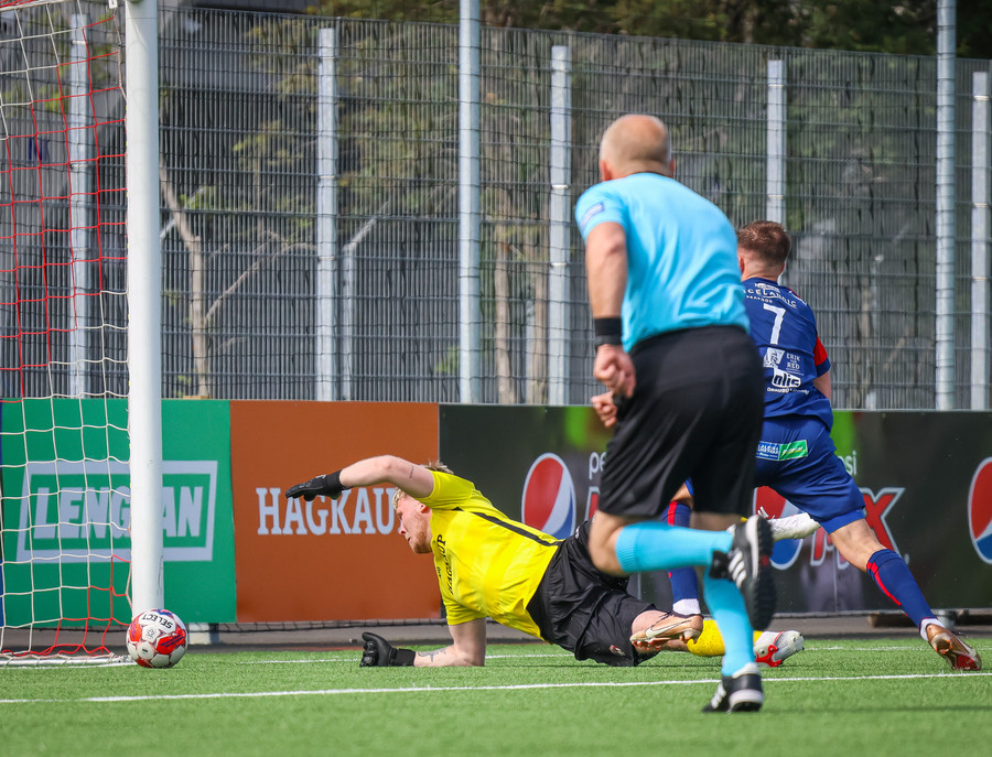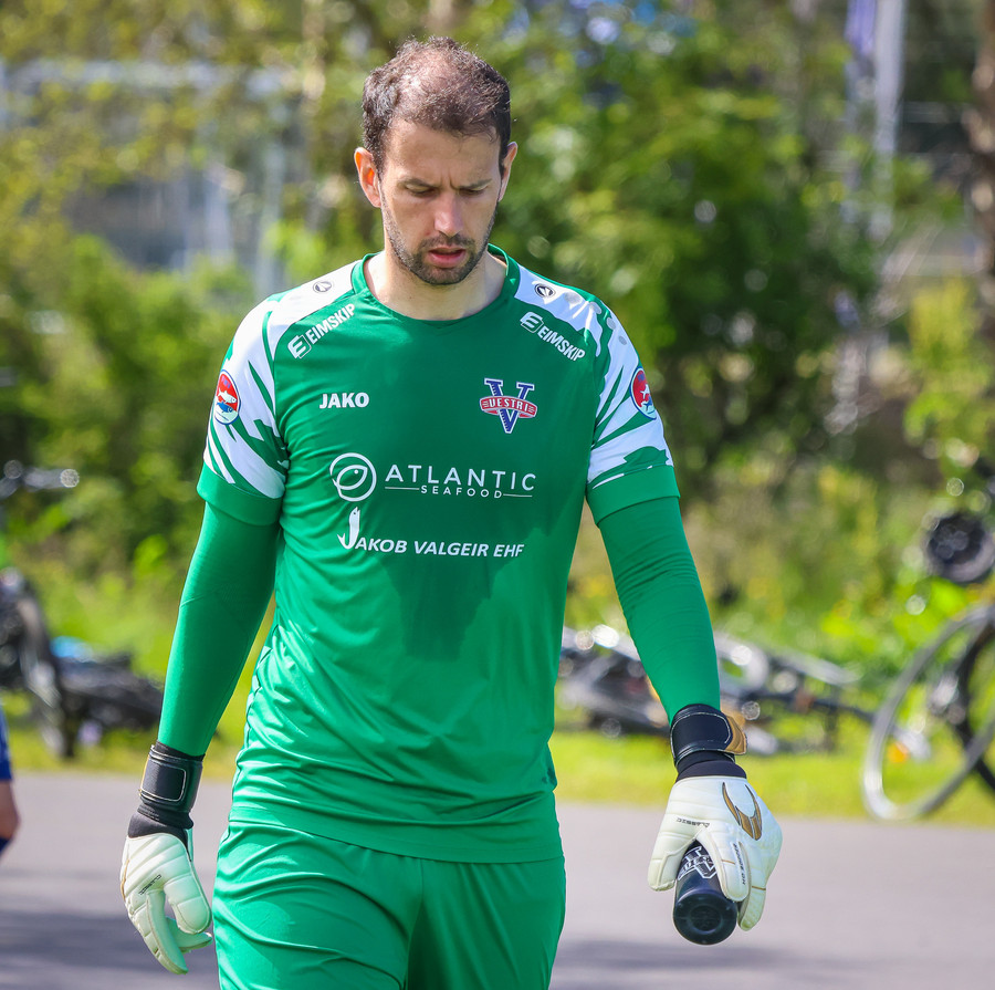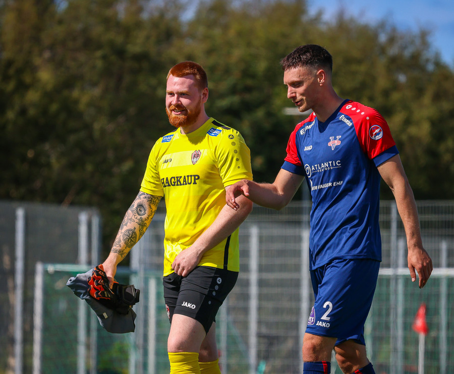 Túfa með vítið sem er slakt. Sveinn Óli ver og handsamar þetta og missir hann svo ansi klaufalega í netið. Sprellimark!