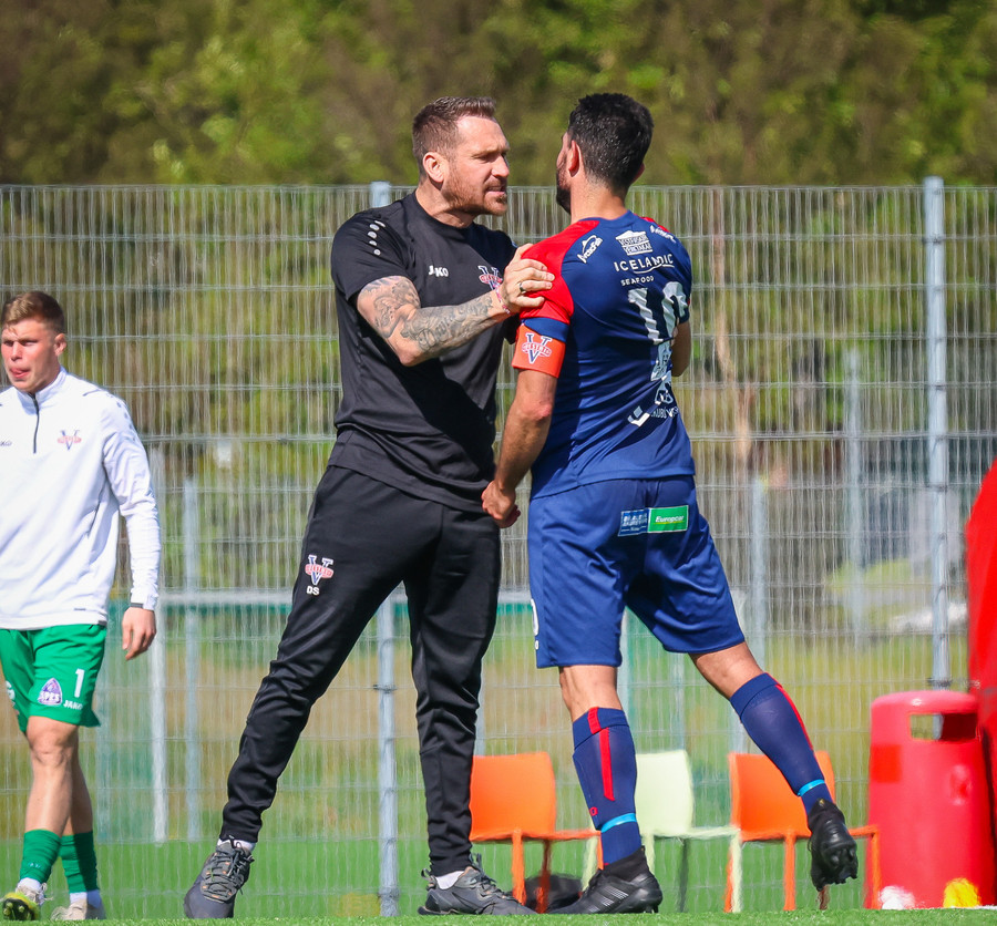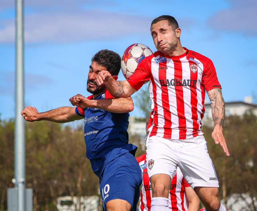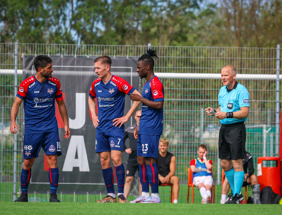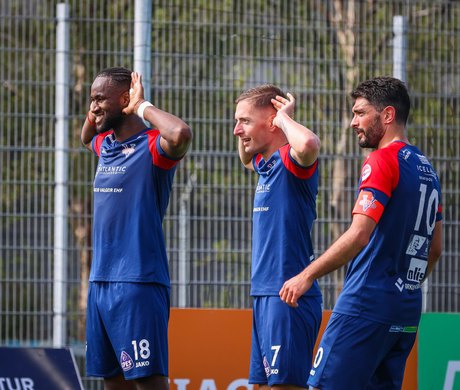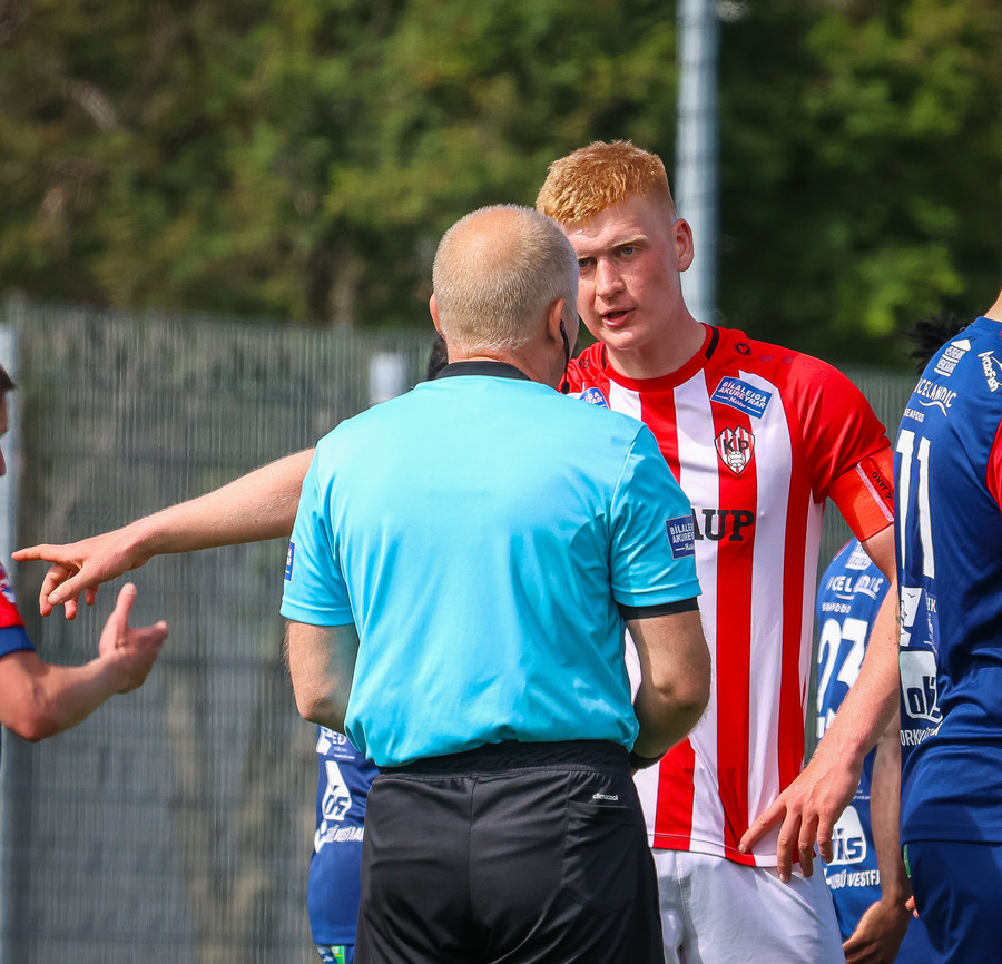 Langt innkast frá Pikul og boltinn fer í þvögu í teignum og þeir heimta hendi og víti. Erlendur ekki á þeim buxunum.