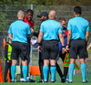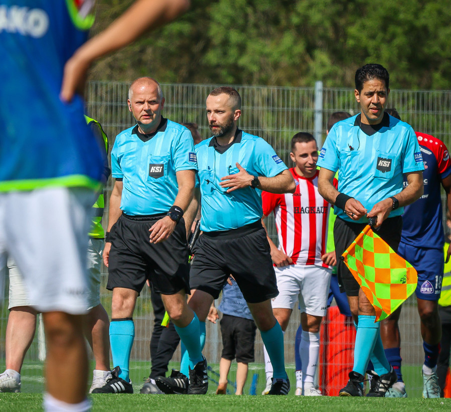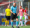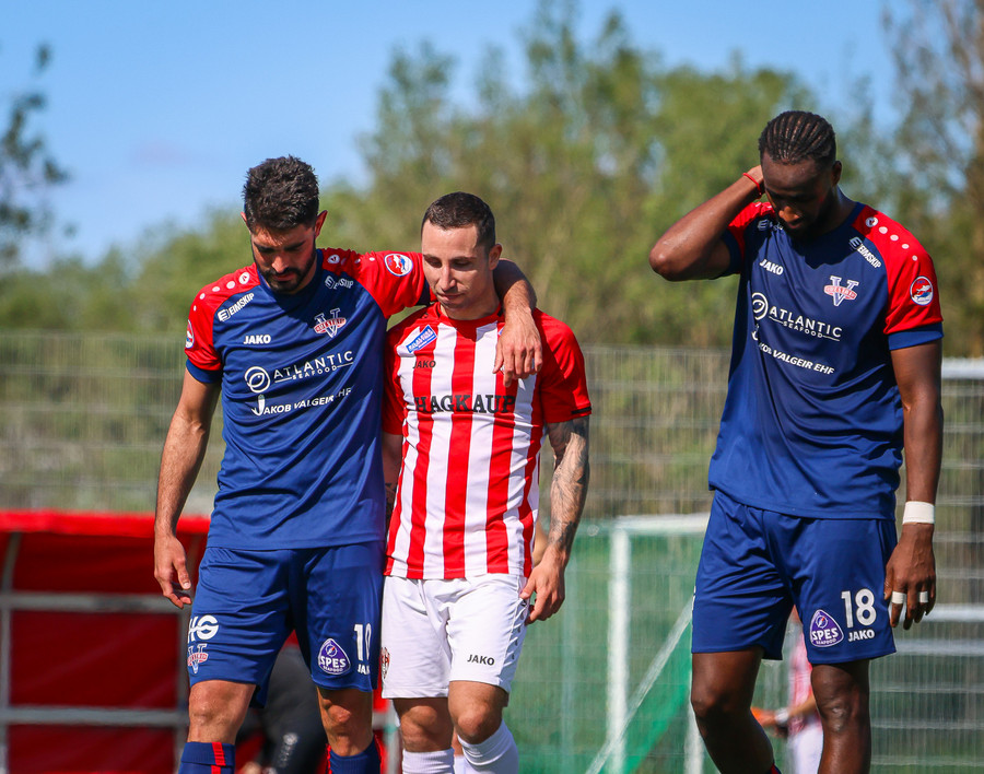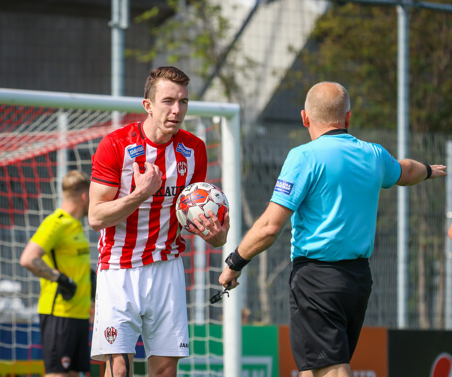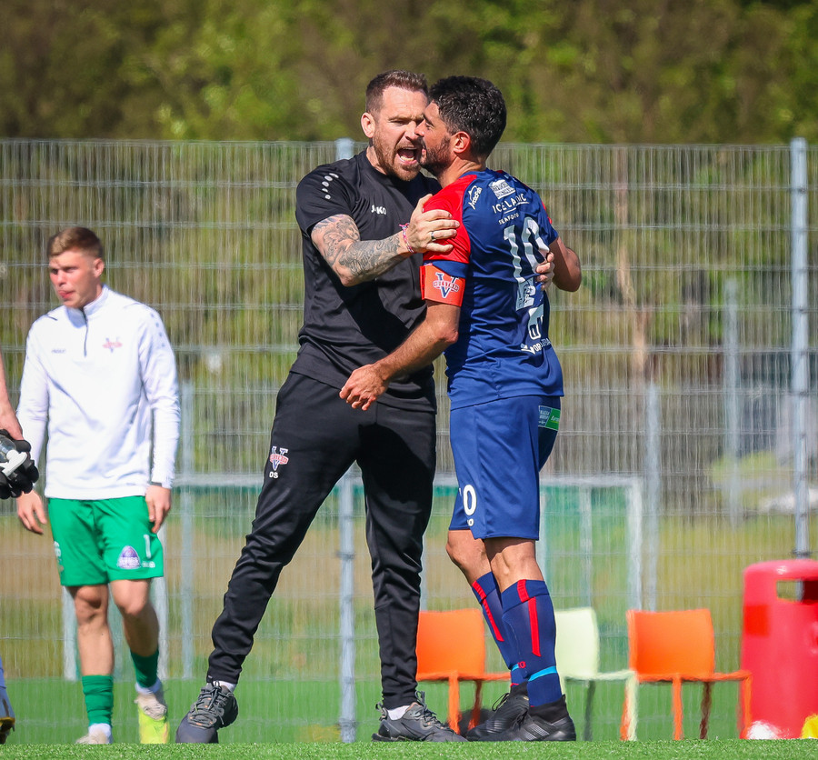 Langt innkast frá Pikul og boltinn fer í þvögu í teignum og þeir heimta hendi og víti. Erlendur ekki á þeim buxunum.