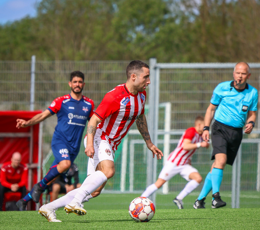Slupski fær boltann úti vinstra meginn og neglir í stöngina. Nálægt því.