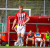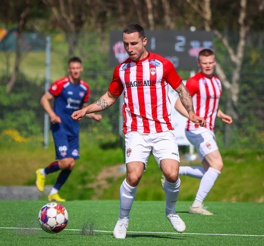 Svífur inn á teiginn. Morten rétt missir af þessu og boltinn lekur hársbreidd framhjá. Hefði getað lekið inn.