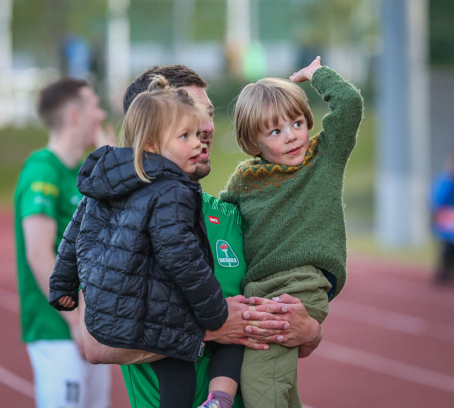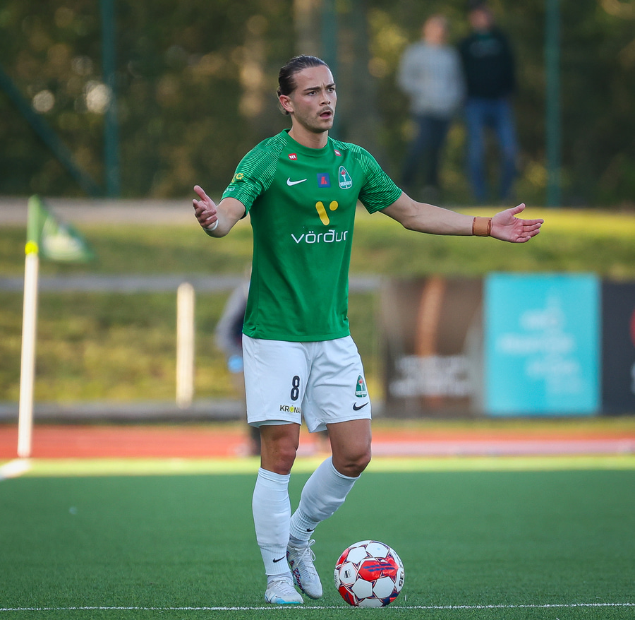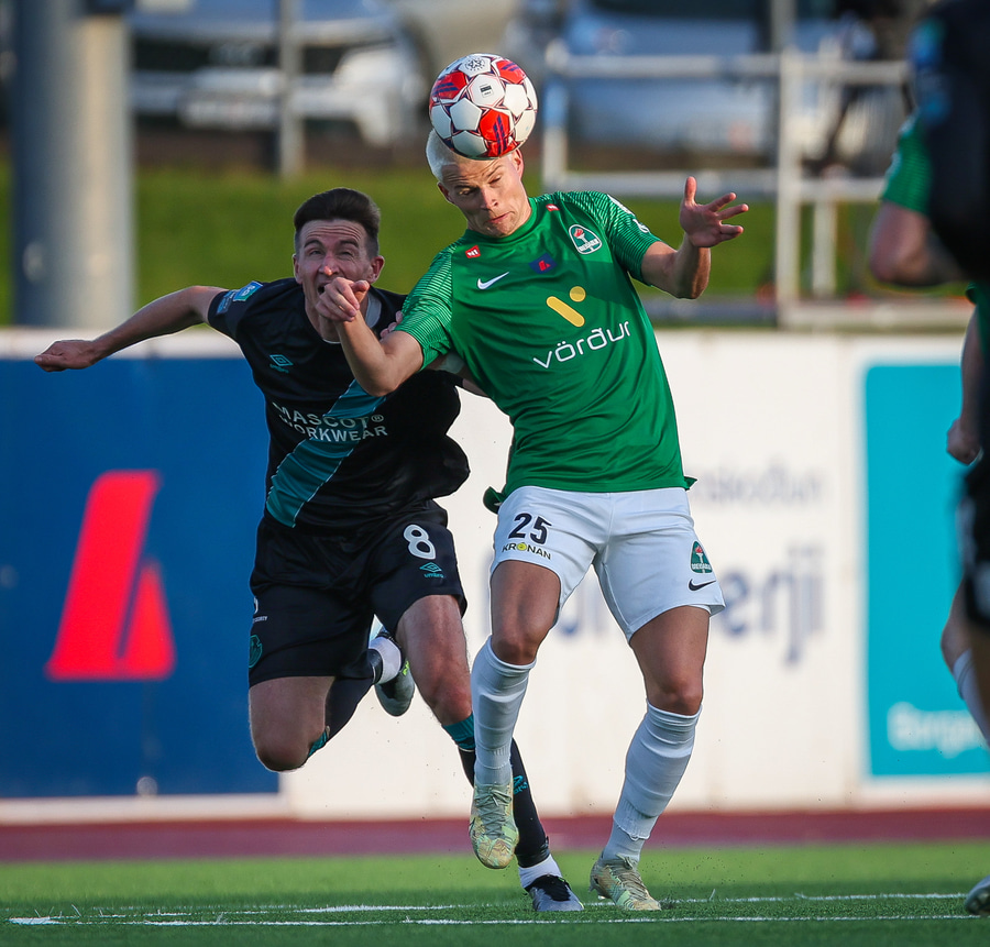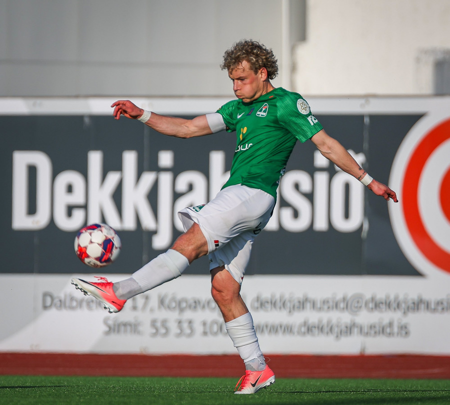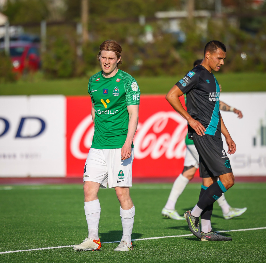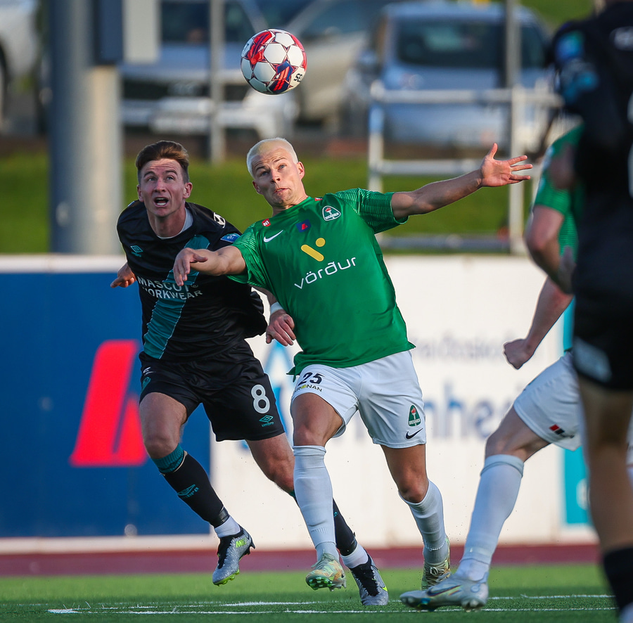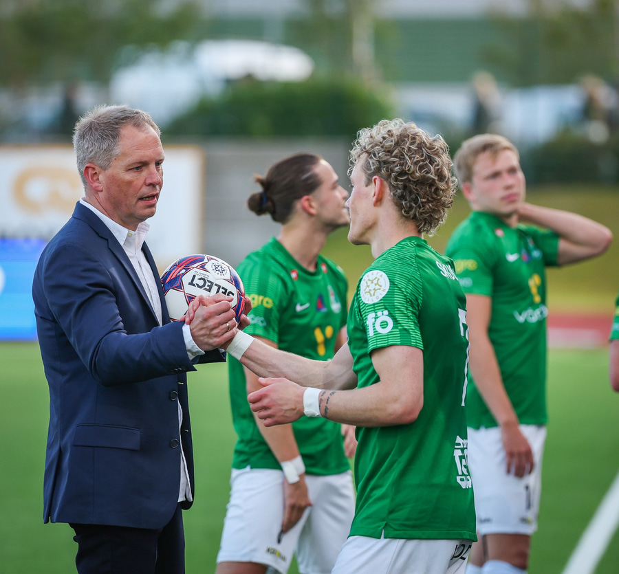 Höskuldur haltrar á vellinum og Arnór Sveinn er kallaður á bekkinn að gera sig klárann