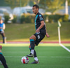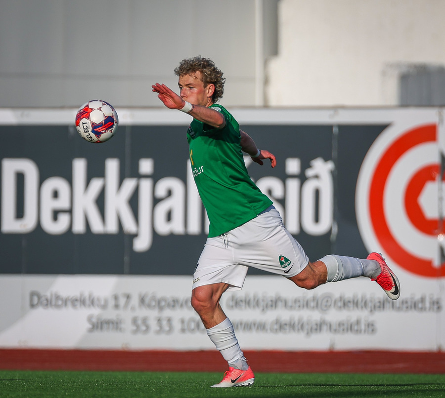 Jason Daði fær boltann nánast á miðlínunni og keyrir upp hægri kantinn