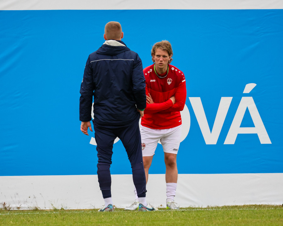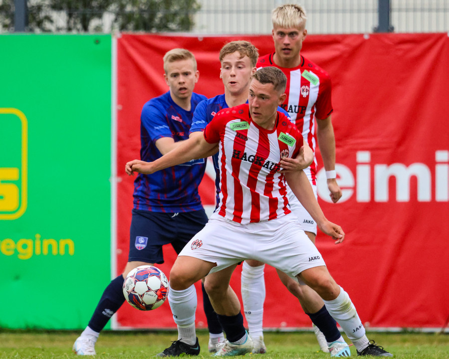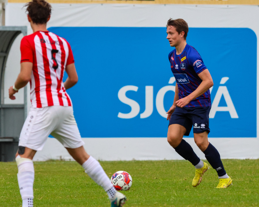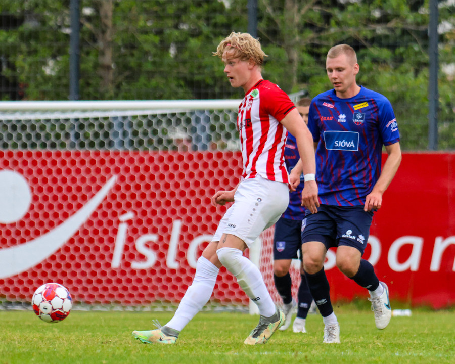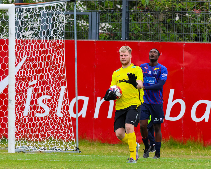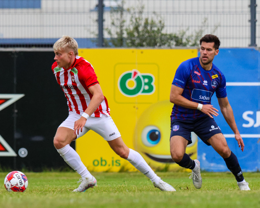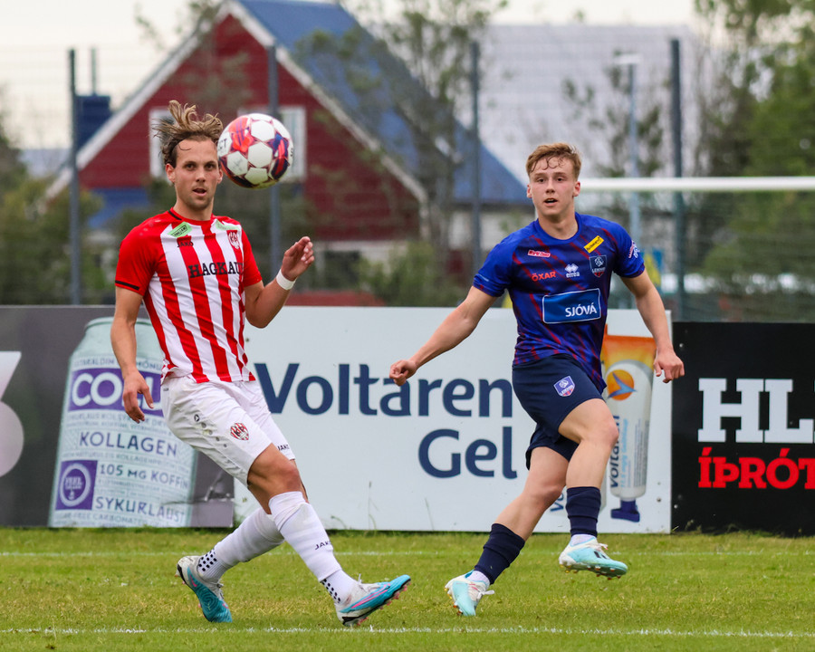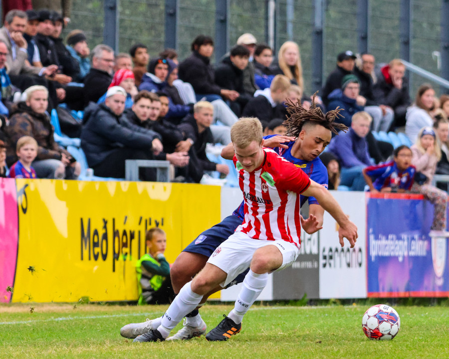 Emil vinnur boltann hátt á vellinum og kemur honum í gegn á Aron. Aron Snær er þá kominn einn á einn gegn Viktori en hann skotið hjá honum fer beint á Viktor í markinu. Þróttarar ívið betri hér í byrjun.