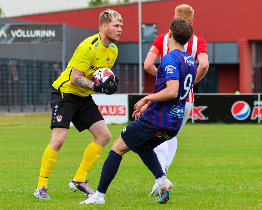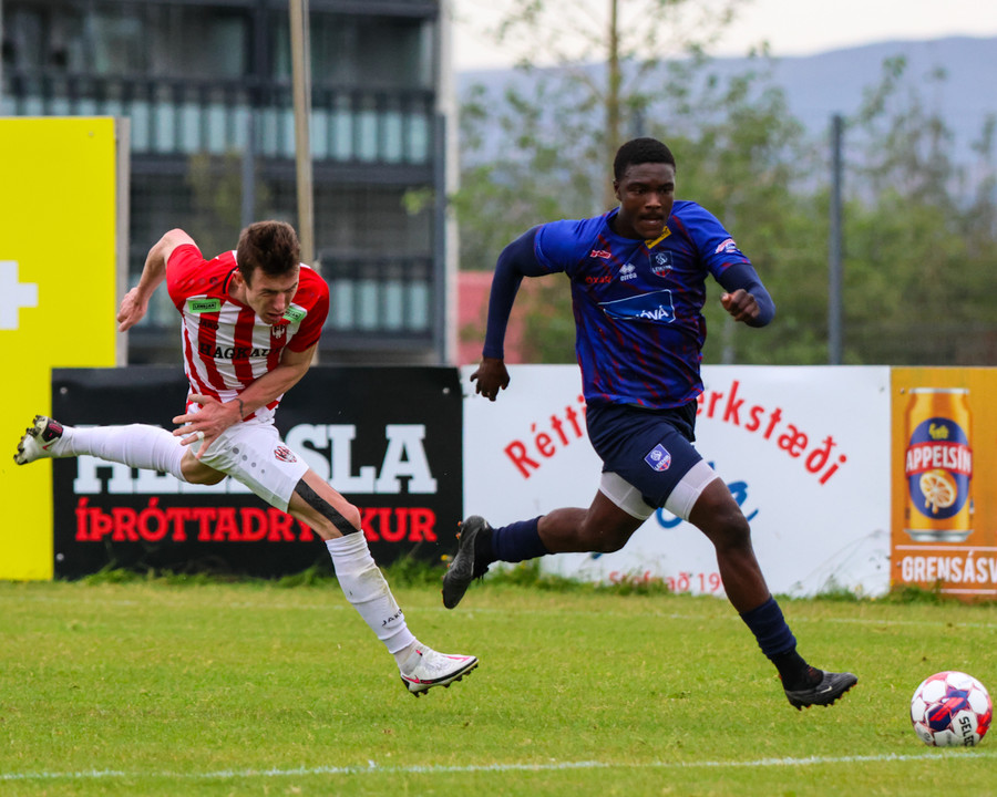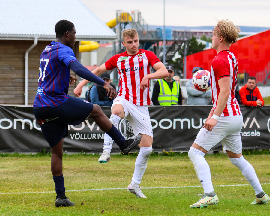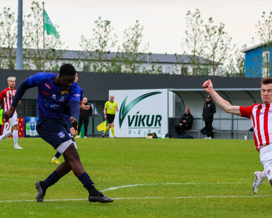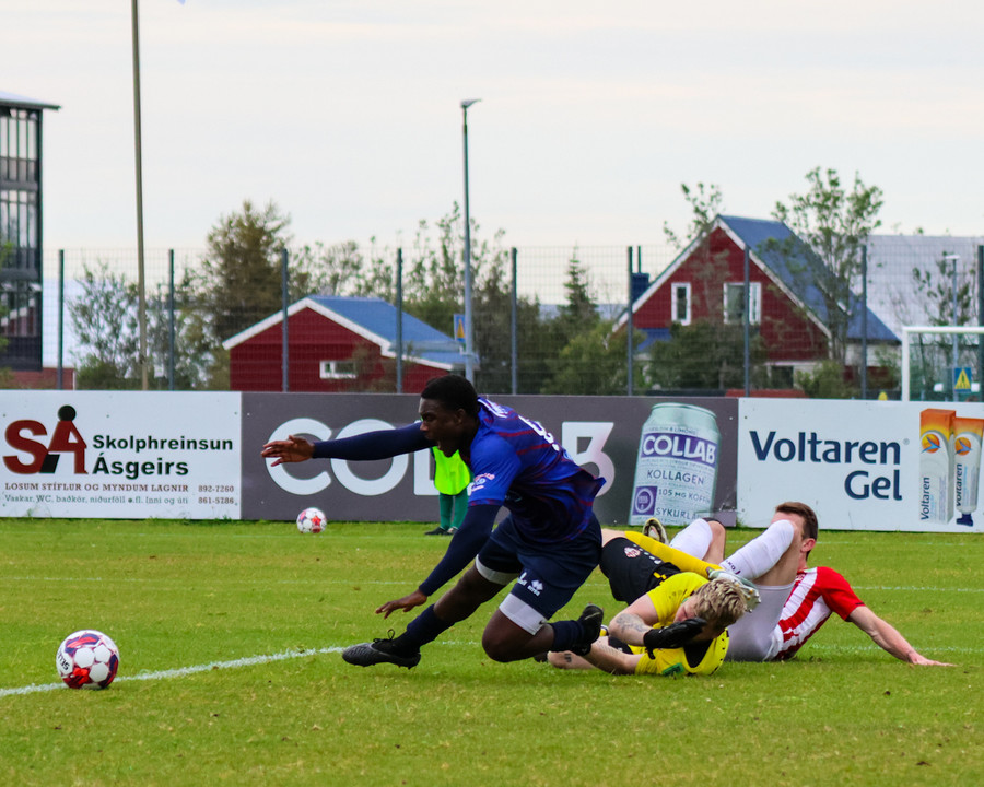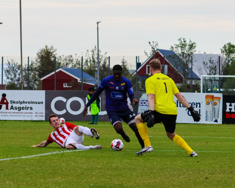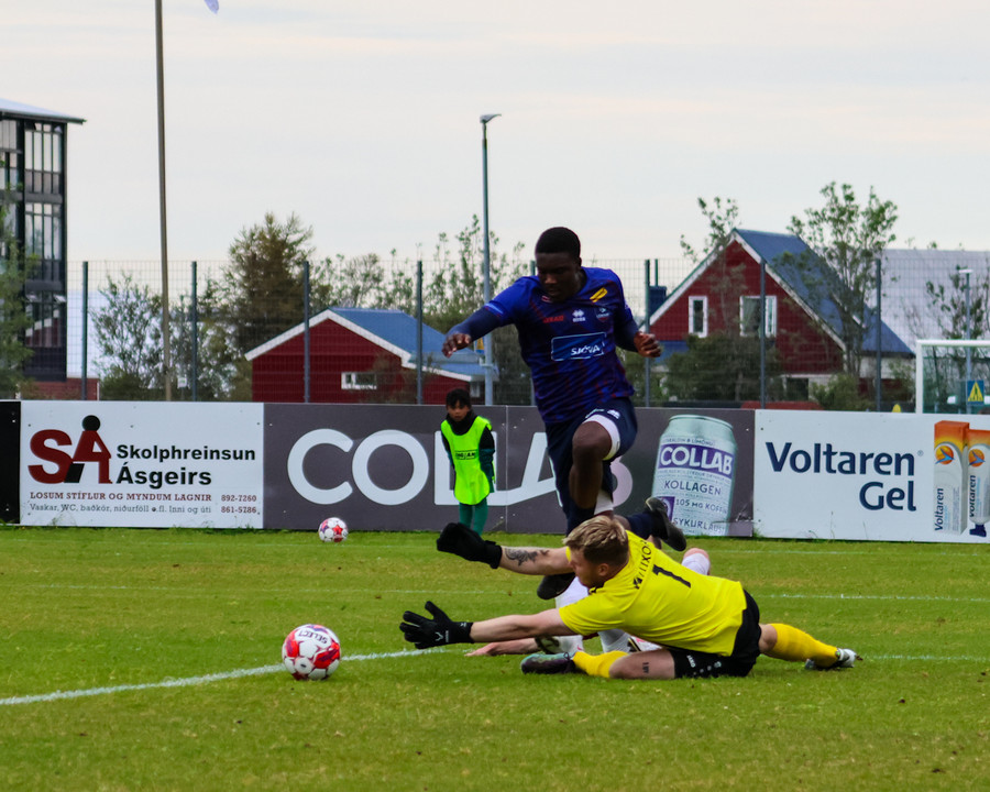 Róbert með geggjaða takta á hægri kantinum eftir að hafa fengið hann frá Sindra. Róbert kemur þá með mjög góða fyrirgjöf sem endar á Omar Sowe sem á fastan skalla beint á Svein Óla í markinu.