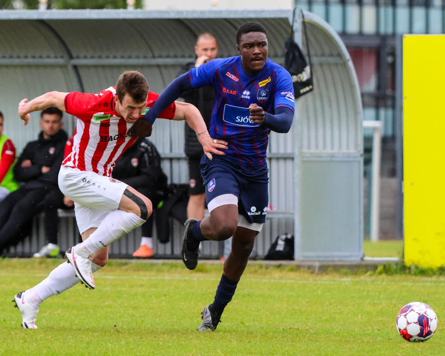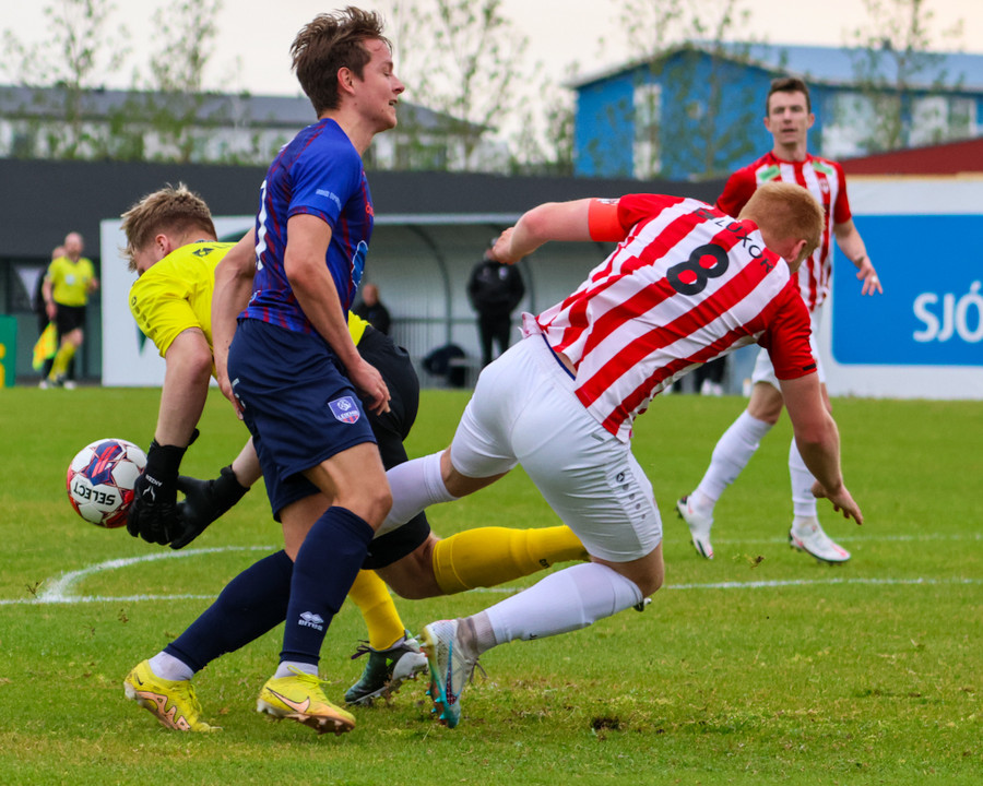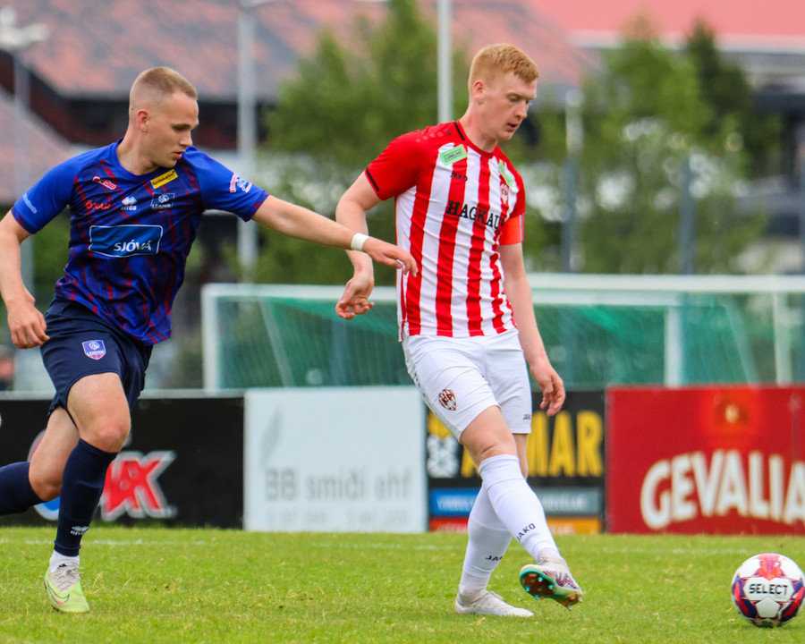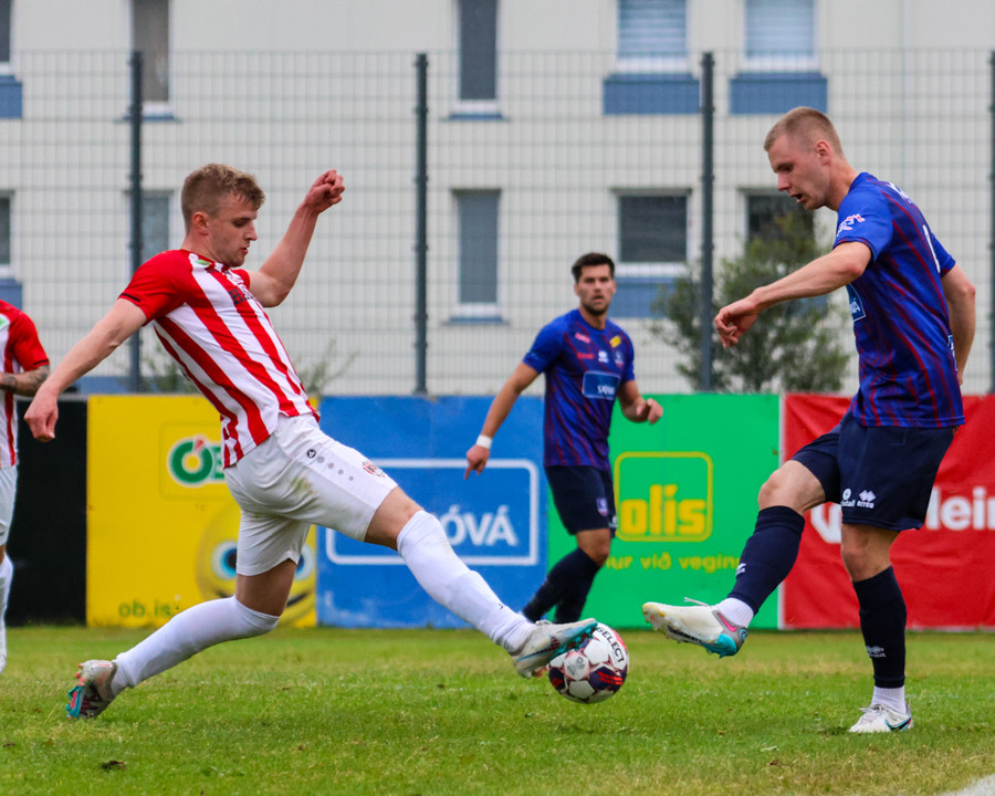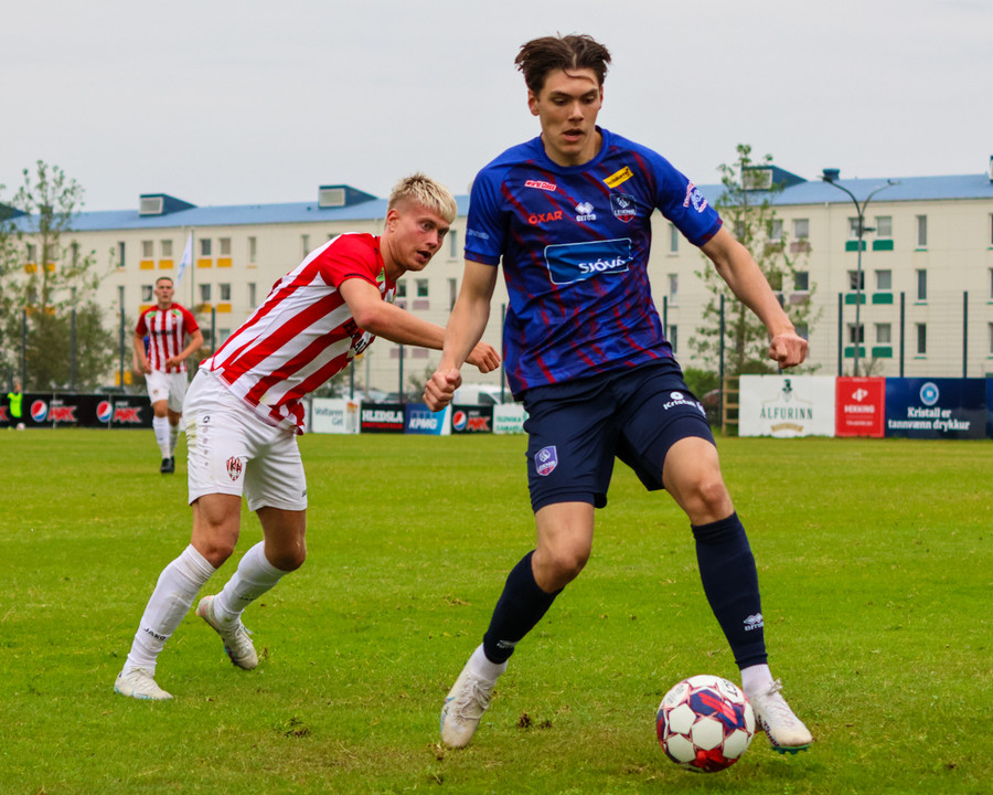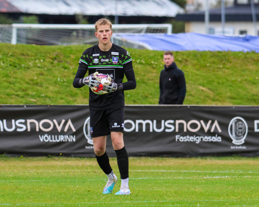 Róbert með geggjaða takta á hægri kantinum eftir að hafa fengið hann frá Sindra. Róbert kemur þá með mjög góða fyrirgjöf sem endar á Omar Sowe sem á fastan skalla beint á Svein Óla í markinu.