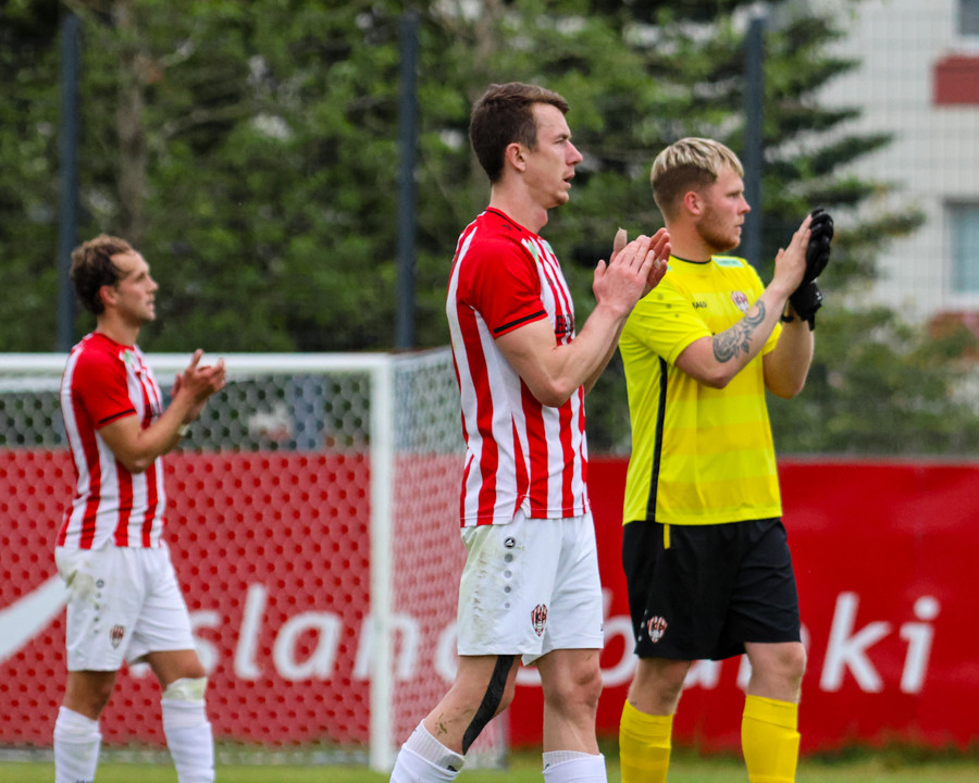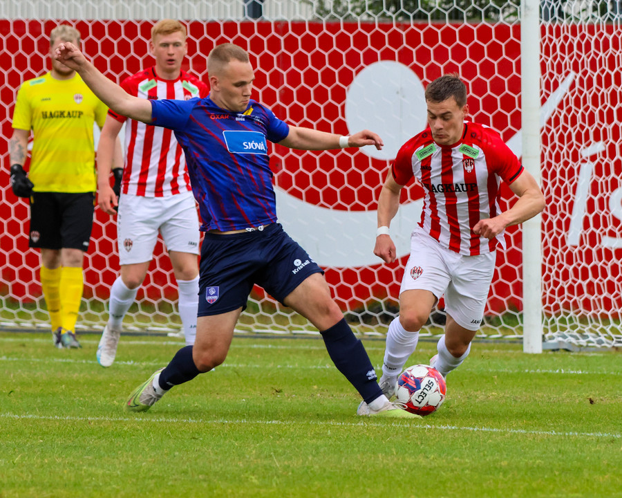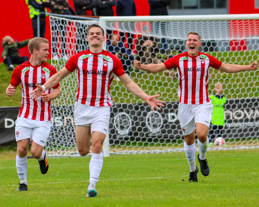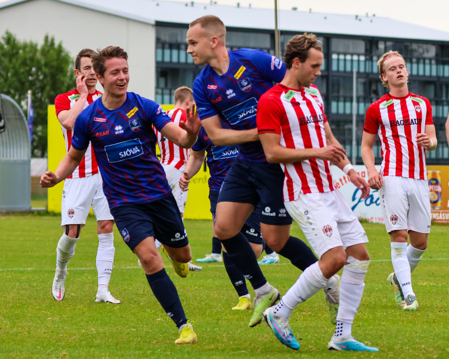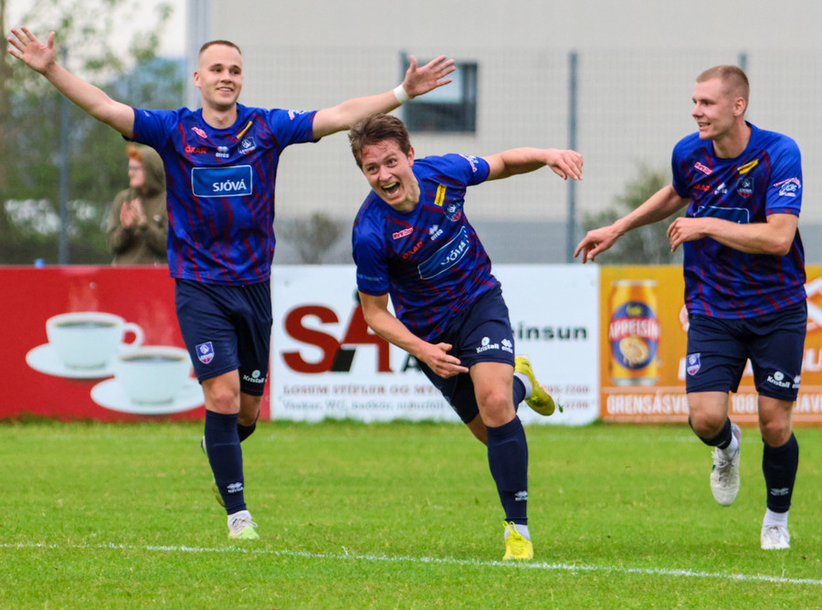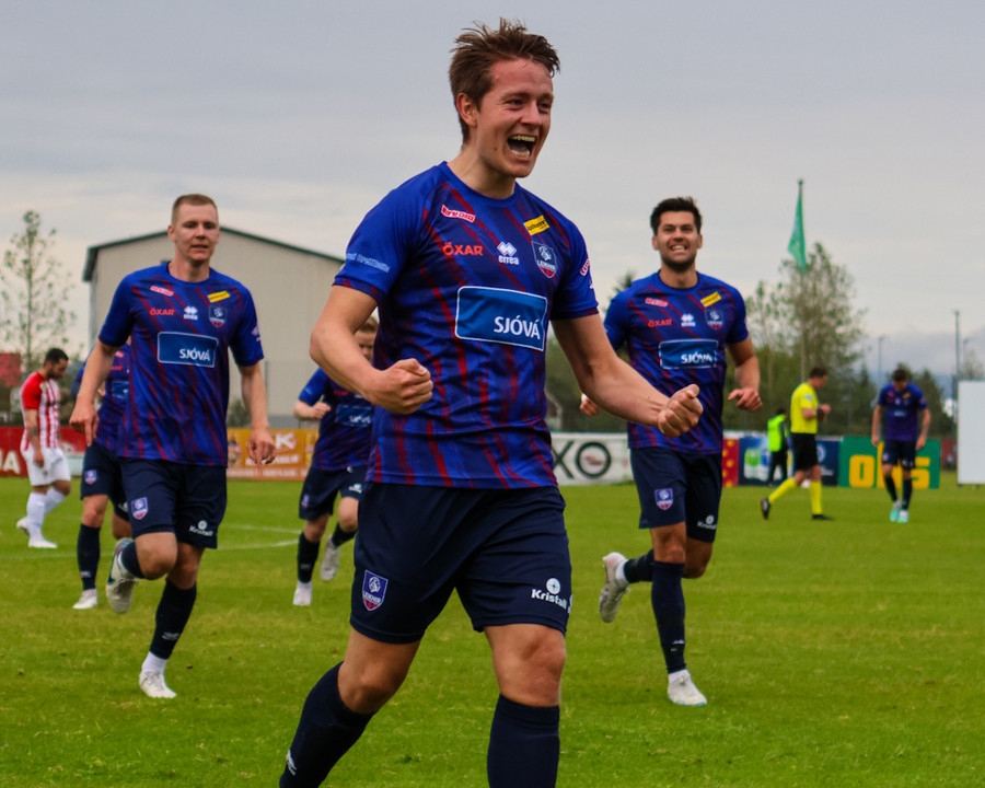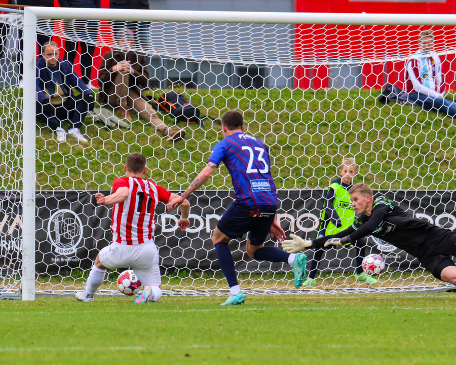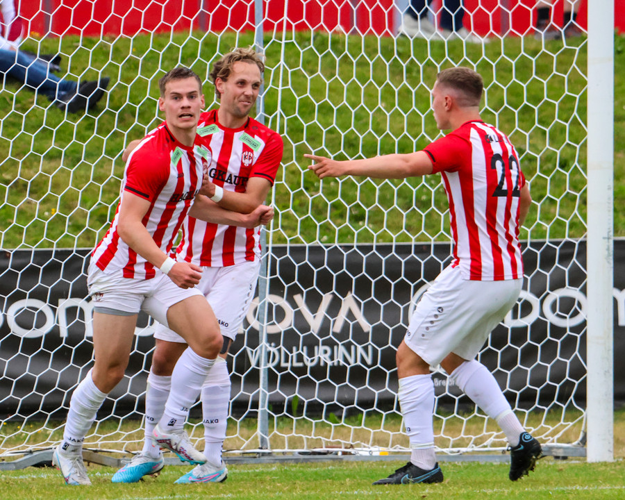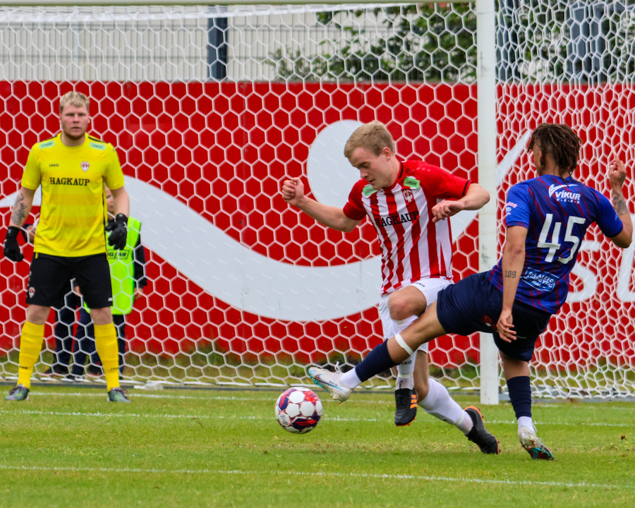 Eiríkur geysist upp hægri hliðina en leikurinn hefur meira og minna farið fram þar. Boltinn fer inn á teig þar sem Jörgen nær að stýra honum á Hinrik sem á misheppnað skot á markið. Það misheppnaða skot endar í sendingu á fjærstöngina þar sem Ágúst Karel mætir og potar honum inn.