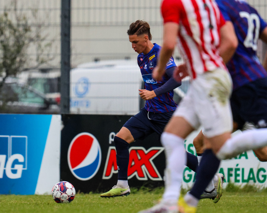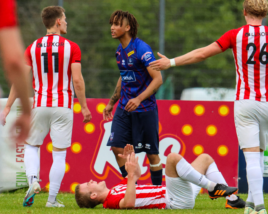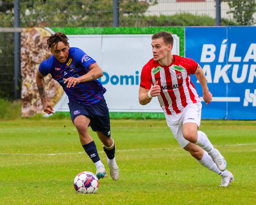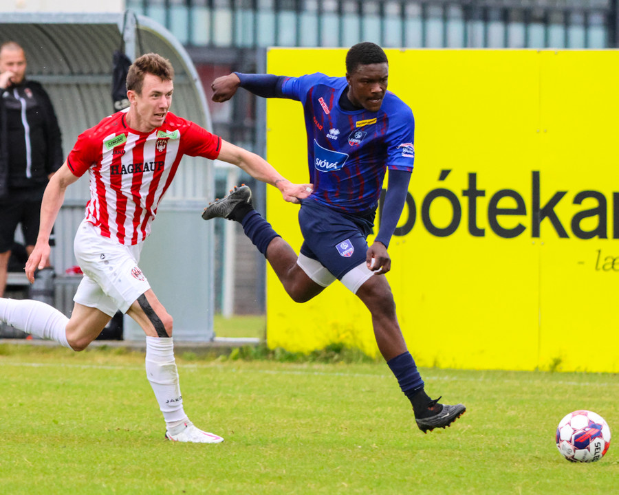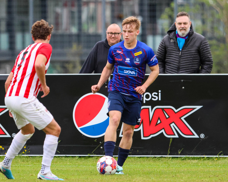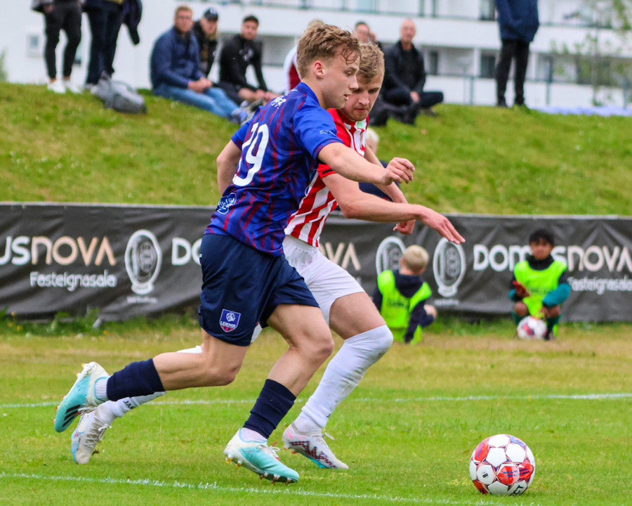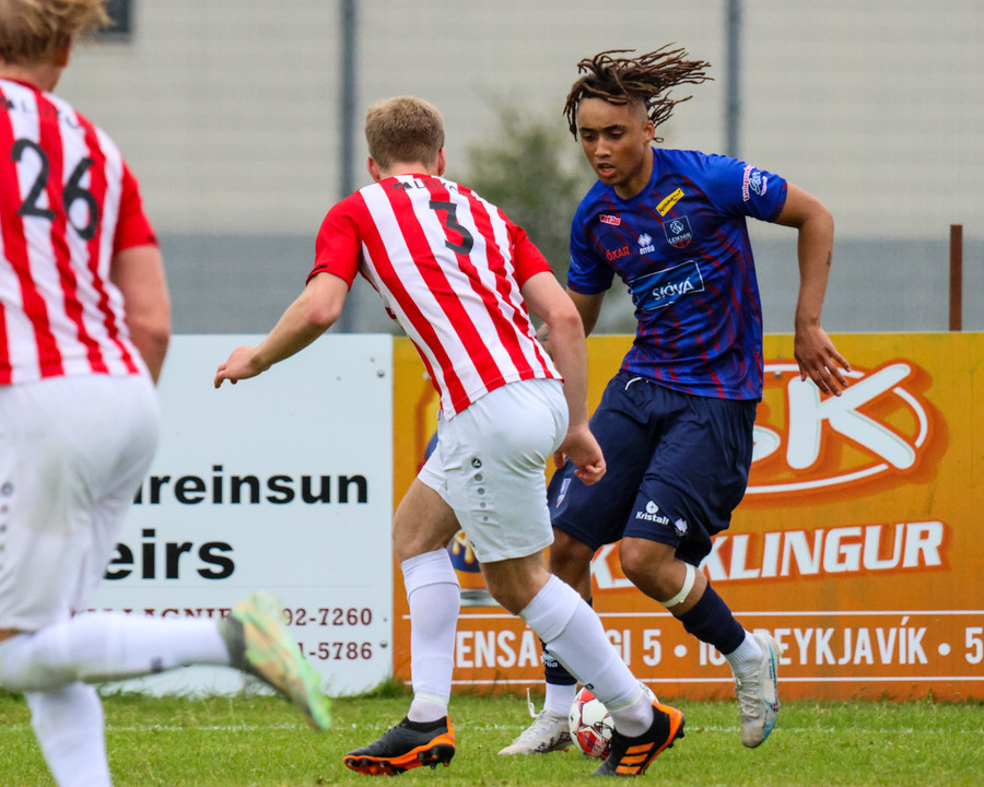 Arnór og Róbert Q spila vel á milli sín á hægri kantinum sem endar með fyrirgjöf frá Arnóri inn á Omar sem hittir ekki boltann nægilega vel og Sveinn Óli kemst í boltann.