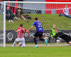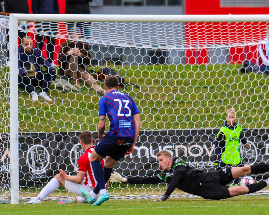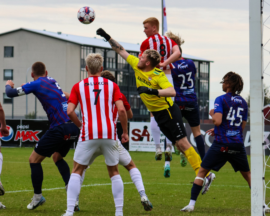Boltinn fer á nærstöngina og Leiknismenn ná að skalla boltanum frá en ekki næginlega langt. Aron Snær er þá mættur inn á teiginn og fær boltann í loftinu og hleður í eina hjólhestarspyrnu. Boltinn fer í varnarpakkann og Viktor í markinu skiljanlega sér ekki neitt. Boltinn endar í netinu eftir viðkomu í Ósvald. Hefði getað skráð þetta sem sjálfsmark á Ósvald en boltinn var á leiðinni á markið.