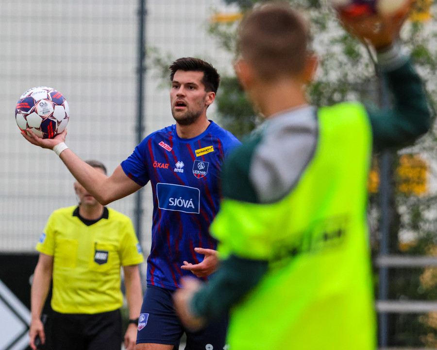 Þróttarar fá innkast við vítateig Leiknismanna sem Pikul ætlar að kasta inn í teiginn.